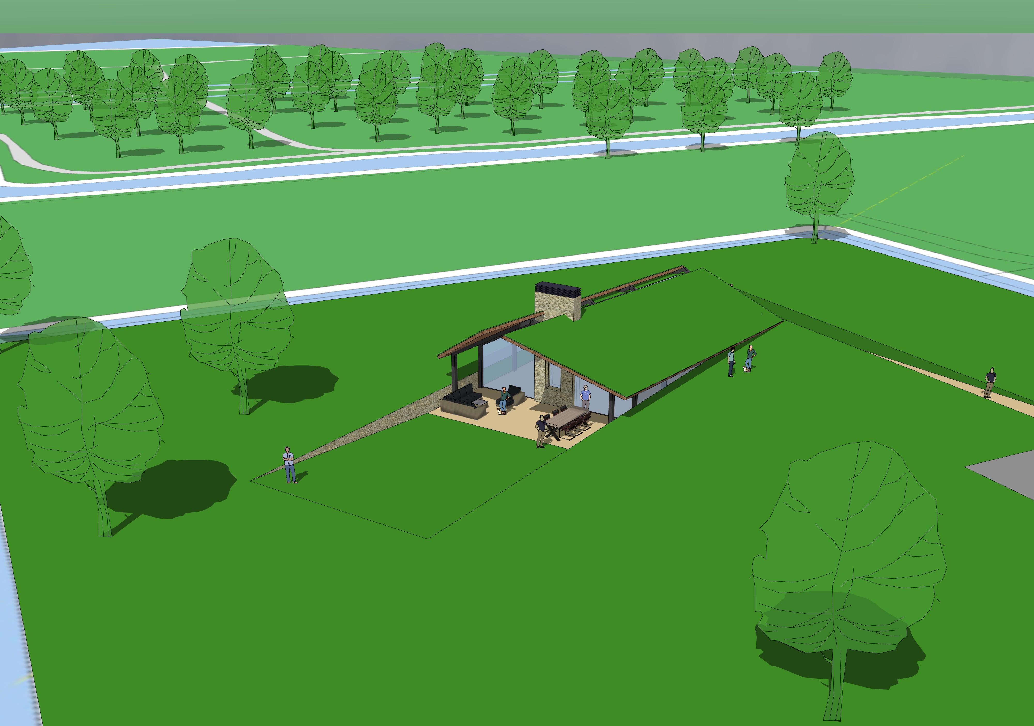 there is grass on the roof of the house the house is placed in a dutch landscape with lots of flowers trees and bushes surrounding it