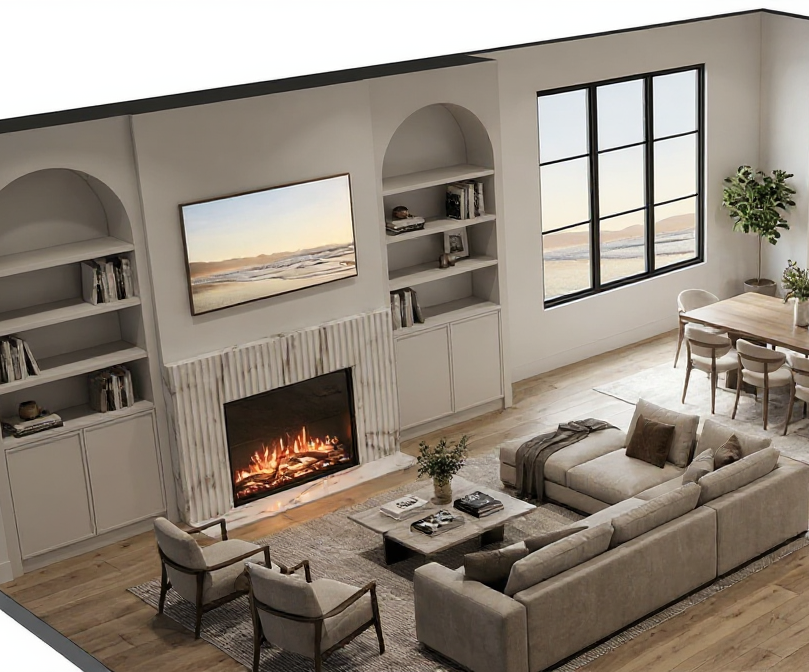 white oak flooring white oak cabinet at fireplace and shelves white oak coffee table shite sectional