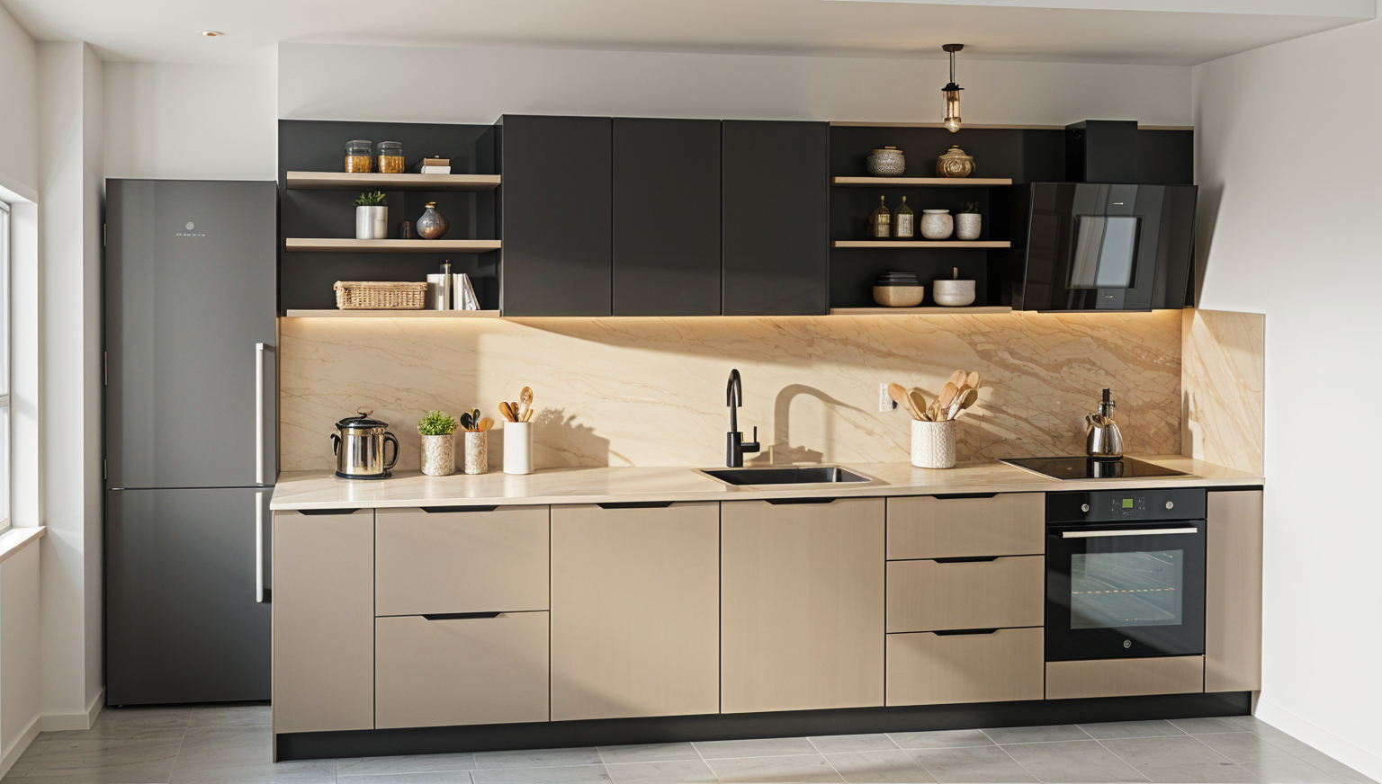 only wall cabinets are dark gray down cupboards are color capuchino black sink ant tap put some accsesoiries on the shelves worktop and wall panel behind the down and up cabinets is wooden oak natural color