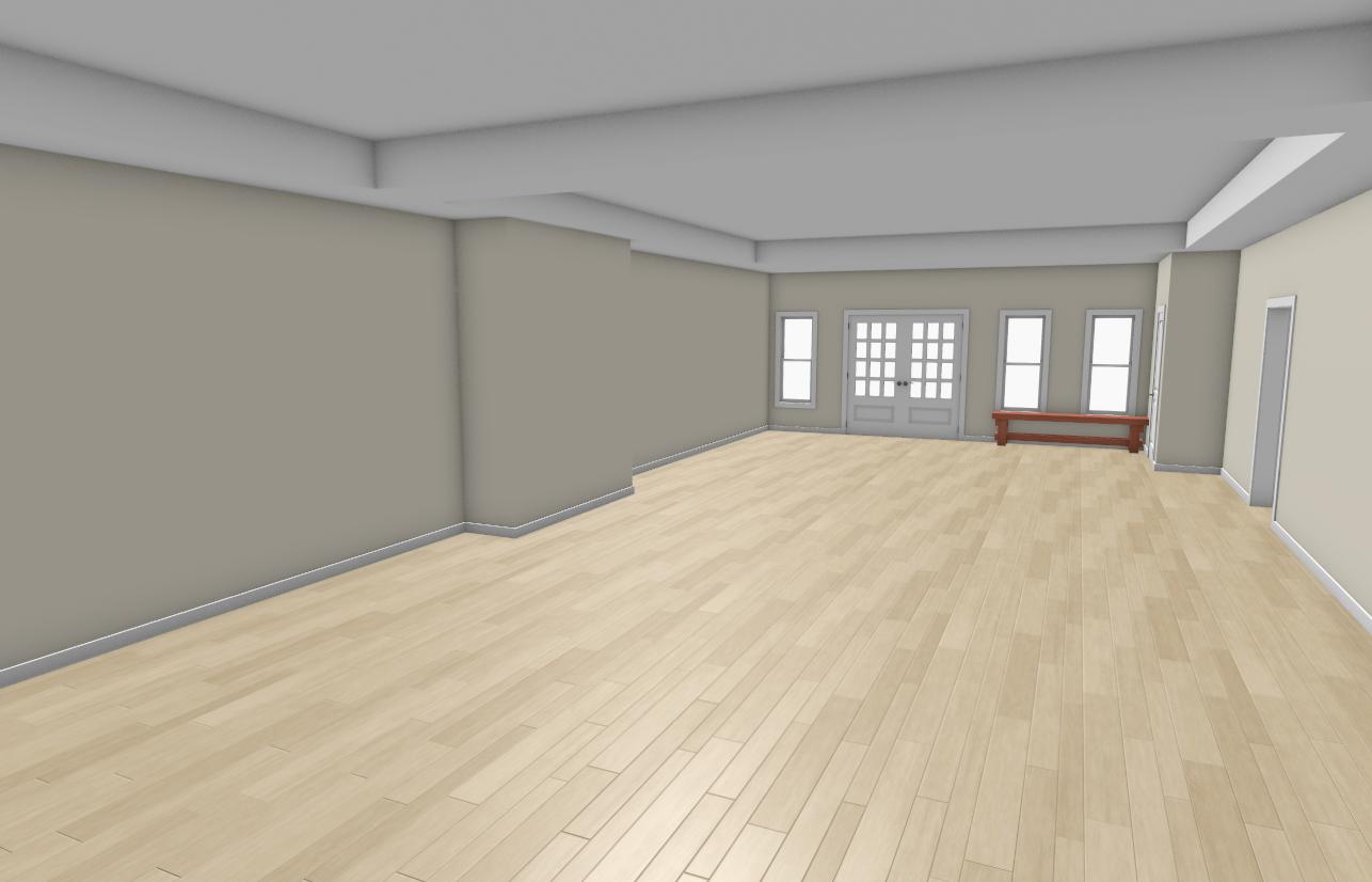 create an elegant 8k resolution and cozy modern interior living room rendering the hardwood floor is a soft light oak complementing the natural tones in the room modern can lightings emit a warm golden glow creating a welcoming ambiance the walls are painted in a soft cream enhancing the light and airy feel of the room tray ceiling as shown add stone on the fireplace bump out add a modern electric fireplace with a wooden mantle and large flat screen tv above it add some modern paintings and photographs on the walls with couches chairs and coffee table in the large living area space