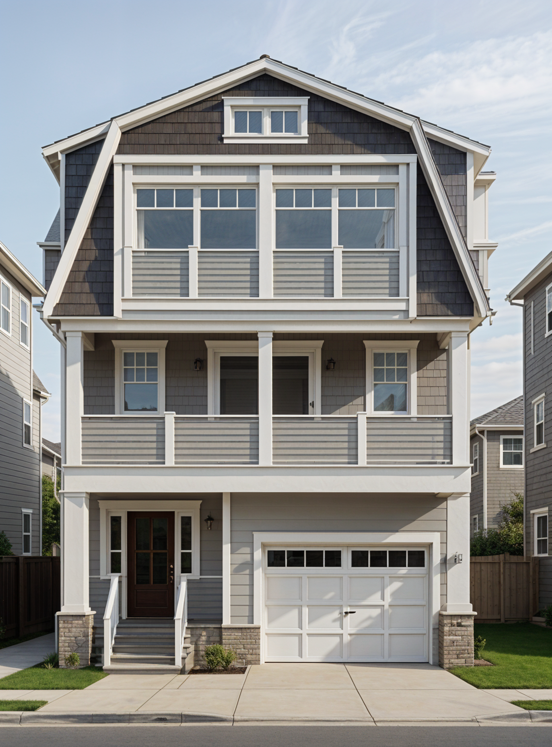 a modern 3 story coastal style home on a raised foundation all of the siding in a light gray tone white trim and white framed windows add crisp contrast throughout the roof design uses a black shingle finish for a bold accent the house rests on a wide concrete slab with simple steps minimal landscaping of grass and small shrubs and a clean coastal streetscape background proportions and window placement should stay consistent with the reference render with a cohesive uniform style on all elevations