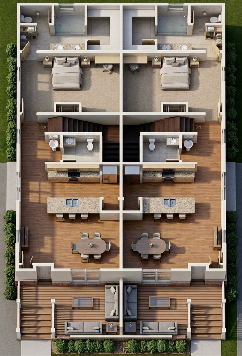 generate exact elevation as copied modern farmhouse off white for an austin texas build to rent community no facade piece should be split in different colors houses are 10 ft apart on each side house should be set back 8ft off a 5 ft sidewalks 6ft deep porch with furniture daytime grass in front yard btr community black windows trim should match siding color behind the window there should be no contrasting window trim vs facade wood posts wood door house next door should be offwhite mostly head on angle no brick cinematic lighting lighth tx stone skirt