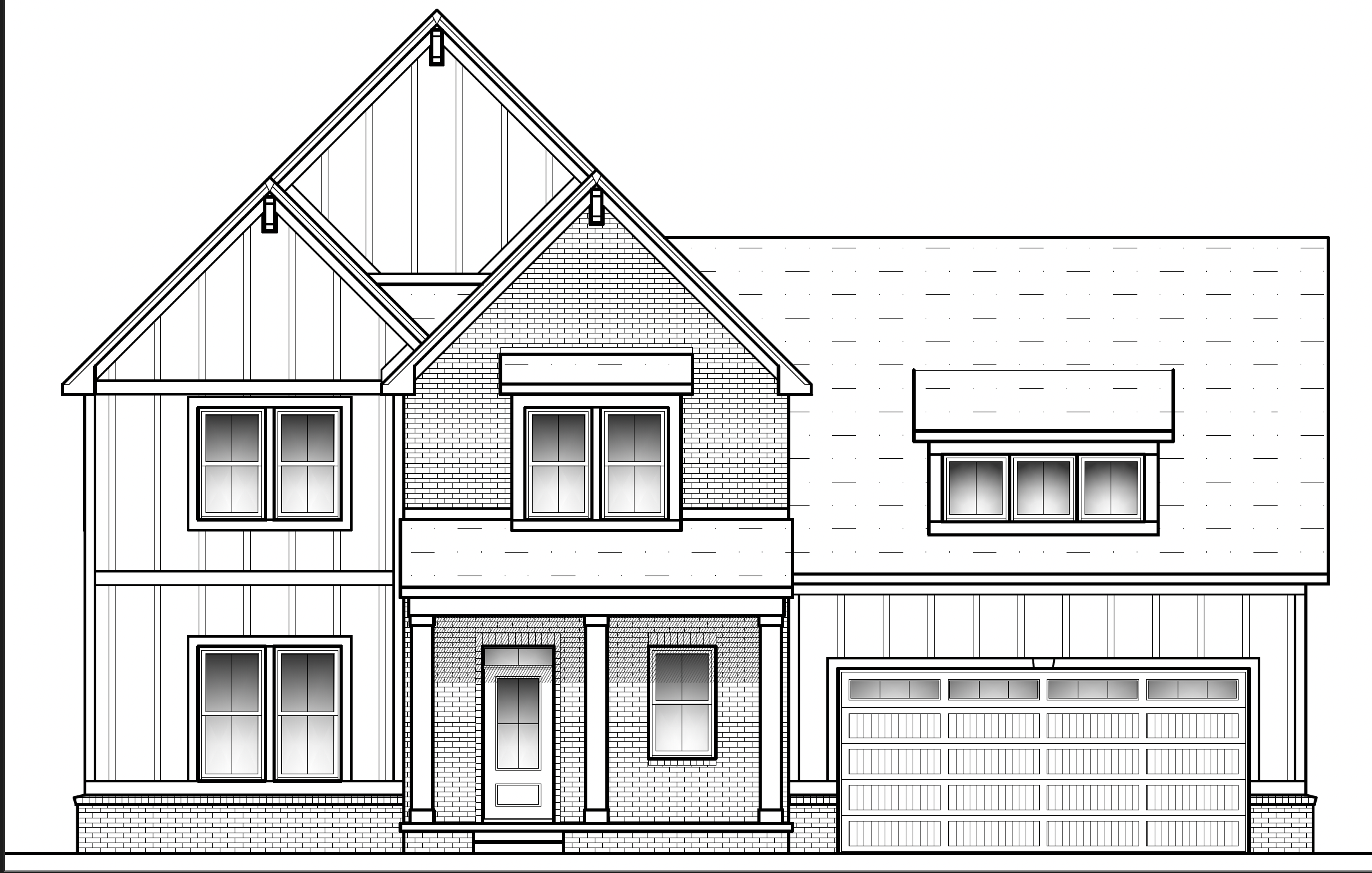 generate a high quality photorealistic render of the provided architectural elevation drawing preserve exact geometry proportions window spacing and material layout render at 4k resolution with ultra realistic daylight lighting clear sky soft shadows ambient reflections ensure all exterior materials colors and textures match the client s specifications exactly match the window grid style do not add any brick to the fa ade do not add extra dormers or light fixtures to the image use only the materials specified in the elevation drawing and color list match each component as follows body coloralabaster sw7008trim coloralabaster sw7008windows blackfront door tricorn black sw6258roof moire blackgutters blackphotometric lighting should highlight color accuracy and realistic reflectivity use global illumination and hdri sunlight calibrated for afternoon warm tone maintain true color fidelity consistent exposure and physically accurate shadows add context elements landscaping realistic lawn shrubs and shadow cast trees suited to suburban setting create concrete driveway straight out from garage door with walkway from front porch to driveway background complementary skies matching exposure no distortion or overenhancement output a single landscape oriented photorealistic rendering that is architecturally faithful visually balanced and color accurate to the above specifications