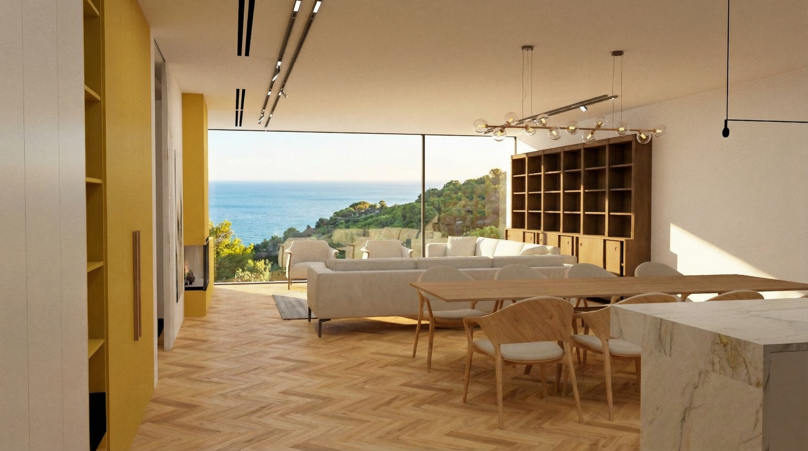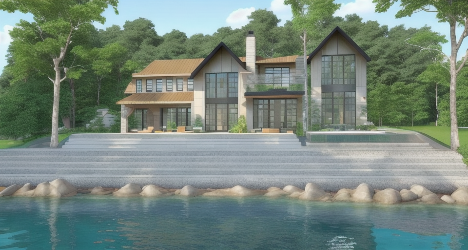 convert this floor plan into a architectural isometric 3d view of a full house show the space from an elevated angle with furniture walls and details visible a beautiful serene lakeside villa surrounded by lush greenery the house features stone walls in earthy beige tones large black framed windows and a quaint wooden roof manicured lawns in vibrant green contrast with tall trees in natural greens and browns the atmosphere is peaceful and idyllic with a gentle reflection of the house on the calm water in soft blues and silvers under a deep early evening sky with hints of navy and gray use the same furniture as shows on the plan do not change the orientation of the floorplan