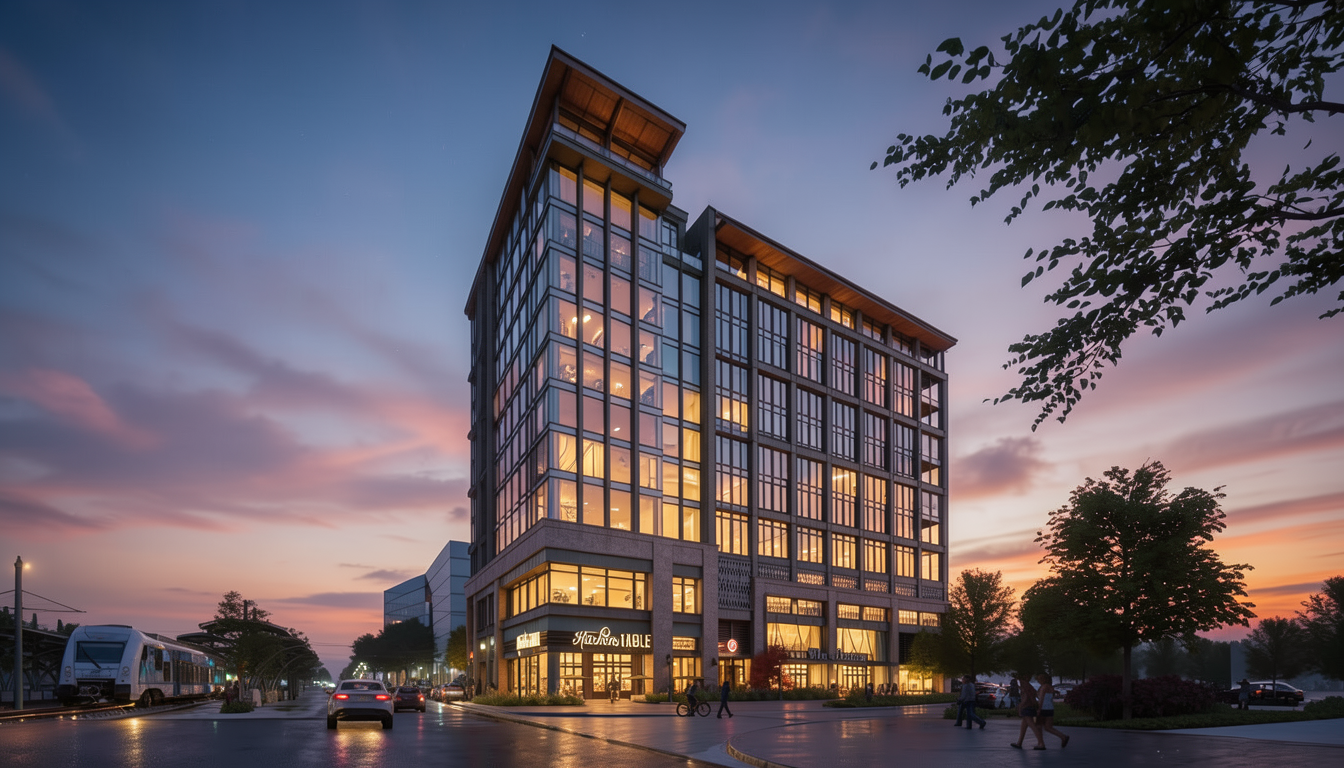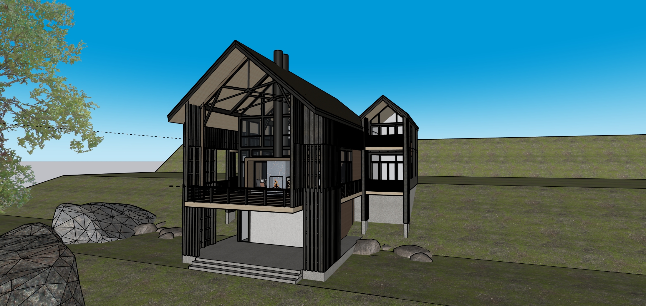 modern mountain house at sunset surrounded by poplar tree forest the house features a sleek wooden facade with large glass windows emitting a warm inviting glow the roof is dark gray with a contemporary design exposed concrete foundation and patio complement the rocky nature of the site the asphalt driveway meanders up the right side of the house to the garage hidden from view behind