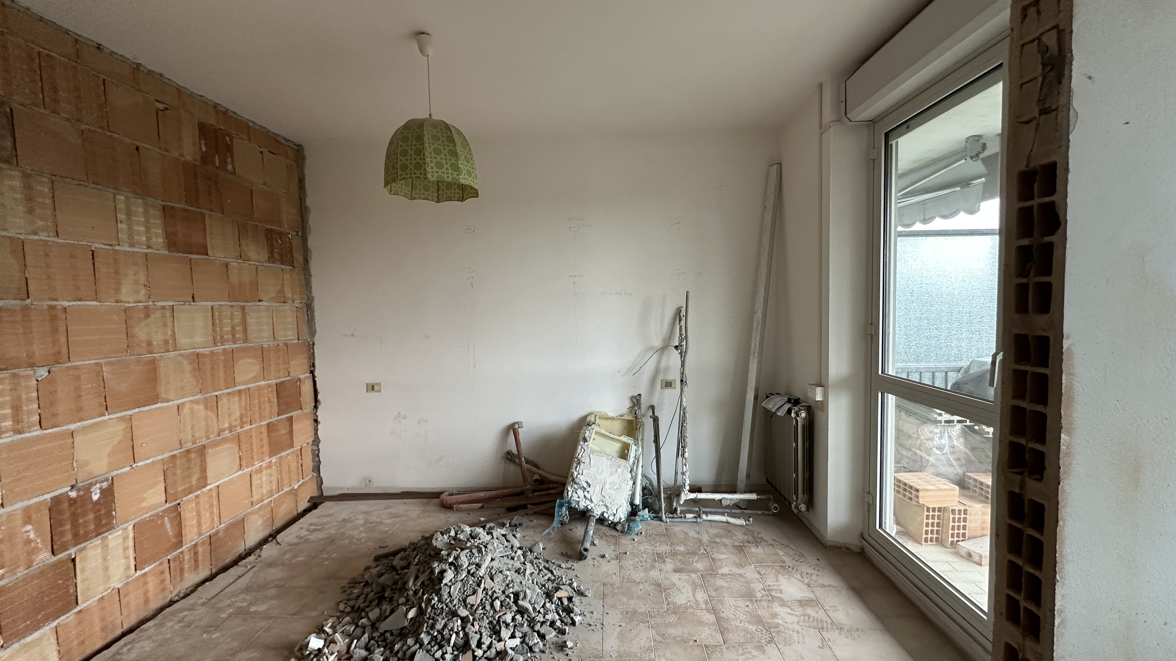 elimina tutti gli oggetti il disordine e anche il lampadario a soffitto e fai un pavimento color grigio in gres un armadio a tutta parete sulla sinistra e sulla parete di fronte della camera da letto posiziona un letto matrimoniale con testata bassa attrezzata con funzione di comodino poi posiziona una applique moderna in asse con il centro del letto sulla parete ad altezza 210 cm dal pavimento considerando che la stanza alta 270 cm