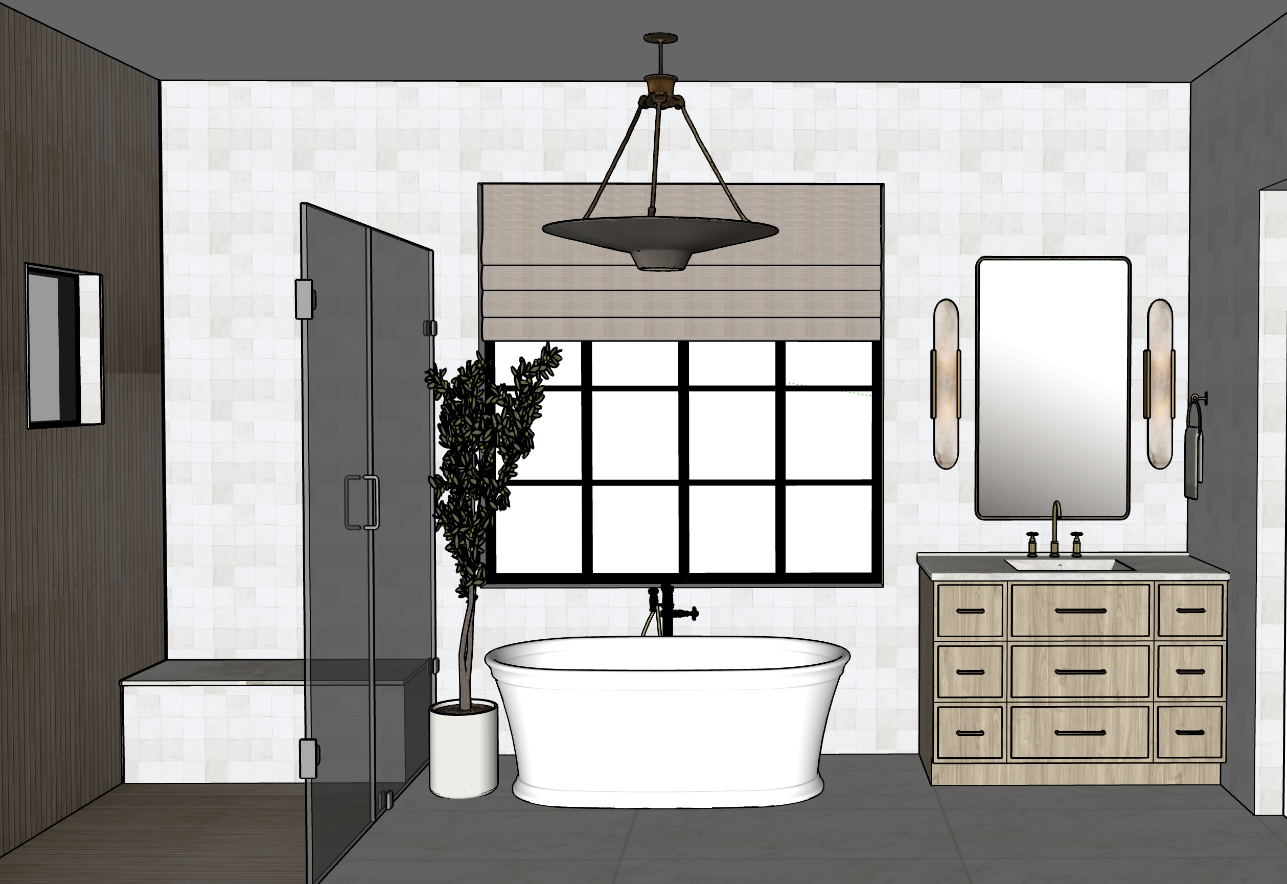 the shade on the pendant light hanging from the ceiling should be a natural jute fiber fabric in a light creamy white the rest of the hardware on the pendant light is brass the tile on the floor is large format white marble with a subtle grey veining eliminate reflections on glass the tile on the wall should be have some subtle variation in a random pattern