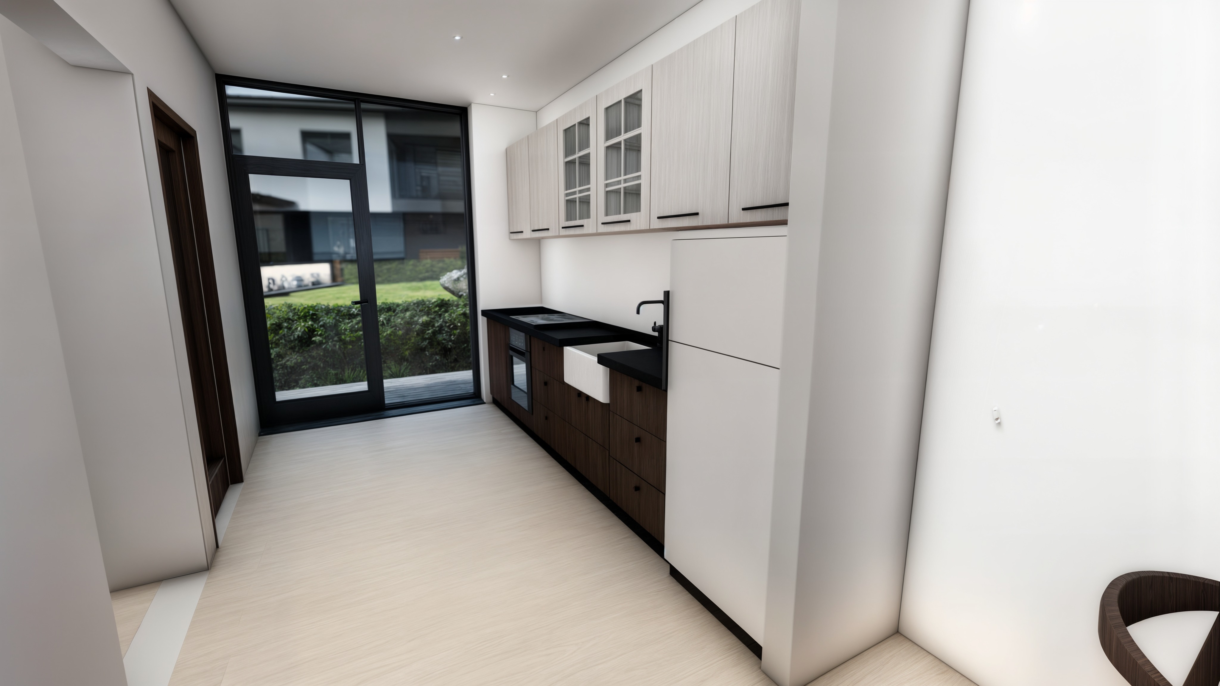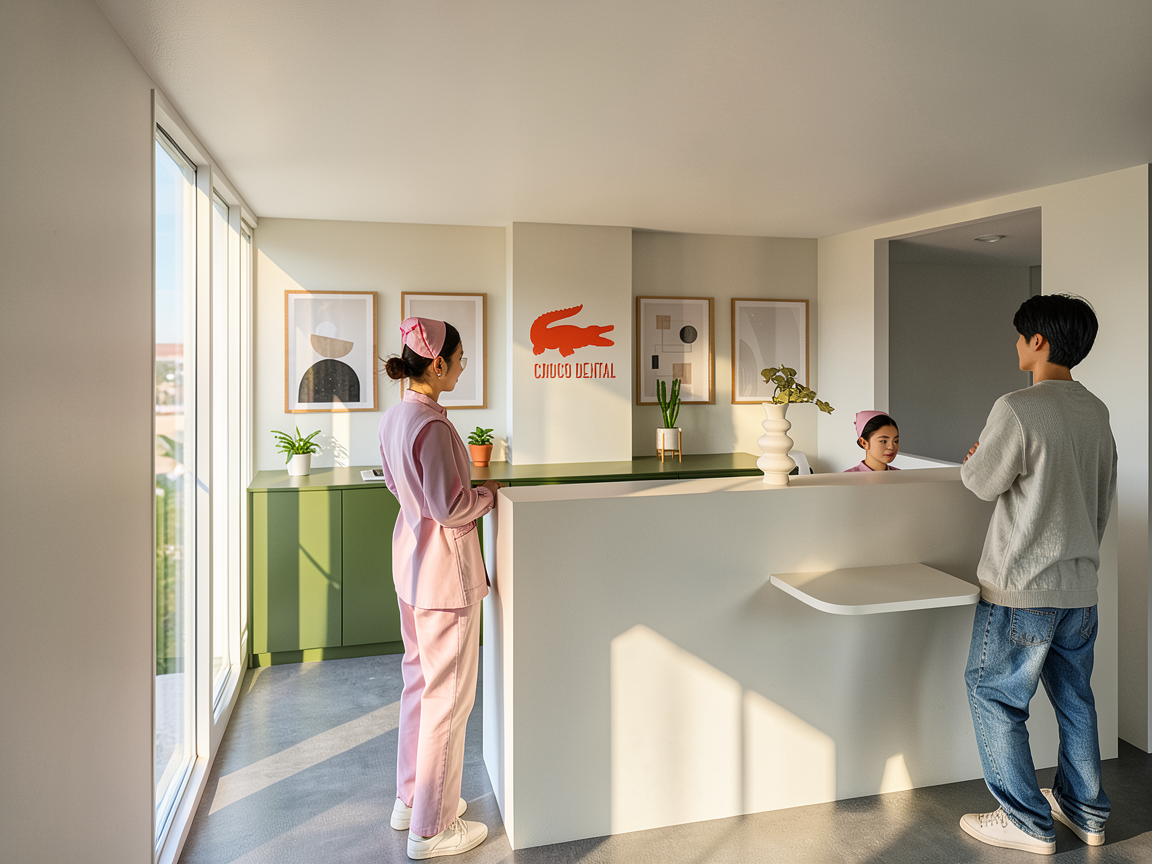 a modern interior office space with an open and welcoming atmosphere include large glass windows with a metallic black frame allowing natural light to flow in the walls should have a sleek charcoal gray texture the floor is crafted from elegant light gray marble tiles incorporate a stylish curved reception desk with white horizontal panels and a black marble countertop add lush green potted plants for a touch of nature the seating area features dark brown leather couches the overall ambiance is professional yet inviting with a balanced mix of natural light and soft ambient lighting overhead