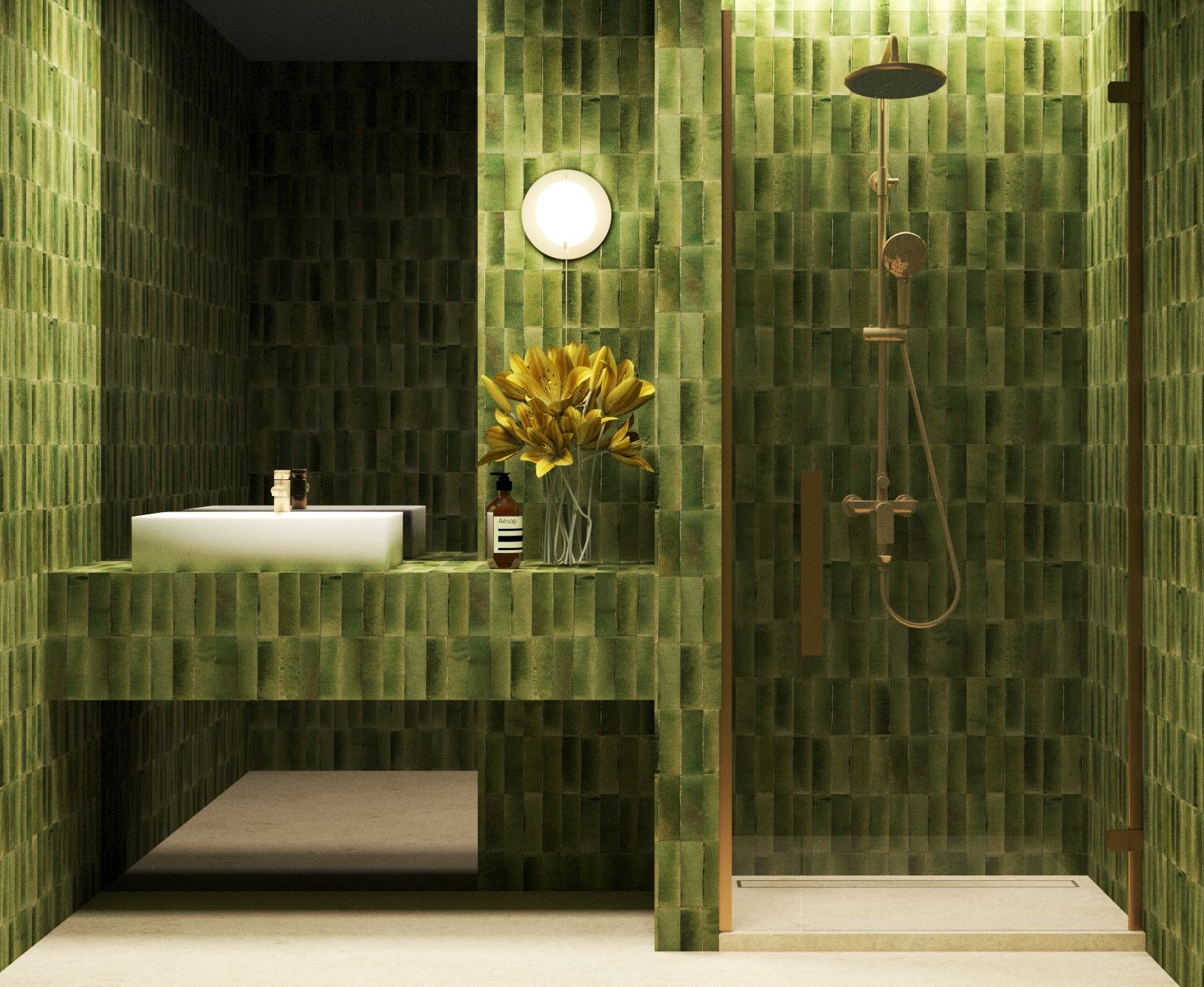 hyperrealistic editorial interior photograph of a compact bathroom fully clad in green ceramic wall tiles the walls are covered with vertically oriented ceramic pieces with varied relief and subtle tonal variation olive moss deep green creating a rich textured surface where the tile pattern is softly perceptible but without visible grout lines forming a continuous yet nuanced skin a monolithic integrated structure emerges from the tiled wall a floating white rectangular sink directly connected to a continuous horizontal slab that extends into a shelf below it a perfectly aligned open rectangular niche minimal and orthogonal the floor is large format beige porcelain with extremely minimal almost imperceptible joints matte finish clean and continuous on the right wall a built in shower area with a completely flush floor no step no visible tray edge featuring a brushed gold shower system with an overhead rain shower and a handheld shower aligned vertically at the entrance of the shower a clear glass shower screen composed of two panels one fixed panel and one opening panel the system has no full perimeter frame only two slim vertical brushed gold profiles on the lateral edges mechanically fixed to the wall and floor with minimal connectors the junction between both glass panels is clean and precise with a vertical rectangular brushed gold handle aligned exactly on the meeting line of the two panels the glass is highly transparent with subtle reflections slight diffusion from humidity and accurate thickness allowing full visibility of the shower behind while adding depth and realism all metal elements match the brushed gold finish of the shower fixtures a circular wall light with a soft warm glow and all fixtures in brushed gold finish on the shelf a glass vase with natural yellow flowers slightly imperfect arrangement and a small amber bottle lighting is soft warm and cinematic with gentle shadows and a poetic editorial atmosphere no harsh highlights balanced exposure with subtle suspended moisture particles enhancing spatial depth camera is frontal with a slight lateral offset no wide angle distortion preserving strict architectural geometry and proportions ultra detailed textures realistic material response high dynamic range subtle imperfections no grout lines no visible tile joints no extra objects no towels no additional mirrors no clutter respect all the elements dont include or replace any element of the picture