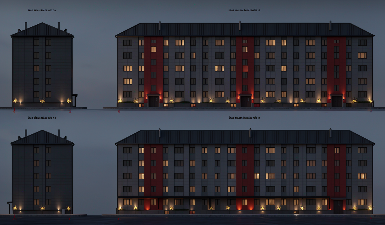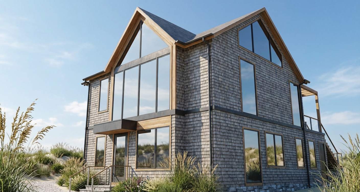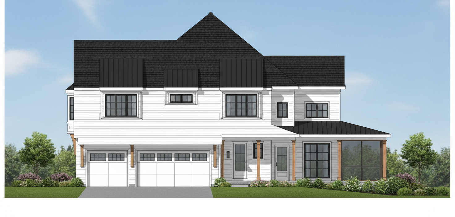 use the provided elevation as the base image keep the elevation exactly the same do not crop zoom resize or reconfigure the image in any way maintain the original structure proportions rooflines dormers and all architectural elements exactly as shown do not redesign reinterpret or add any new elements critical restrictions do not add any roofs awnings or overhangs anywhere on the elevation do not add a shed roof over the garage doors do not change the roof massing in any way do not add wood details or change the material of columns beyond what is specified do not apply siding color or material to roof surfaces except as listed below material updates main siding clean white siding on all vertical wall surfaces main roof black asphalt shingles dormer shed roofs only lighter black or medium dark charcoal standing seam metal with subtle reflectivity to contrast with the main roof garage doors white columns painted white do not change shape or add wood details all windows and doors black wood corbels and other existing wood elements keep natural wood tone do not add or change any wood detailing rendering instructions make the elevation a high end photorealistic architectural rendering with realistic lighting shadows and material textures emphasize contrast between the dormer metal roofs and the main roof while keeping the design true to the original background should be simple and natural