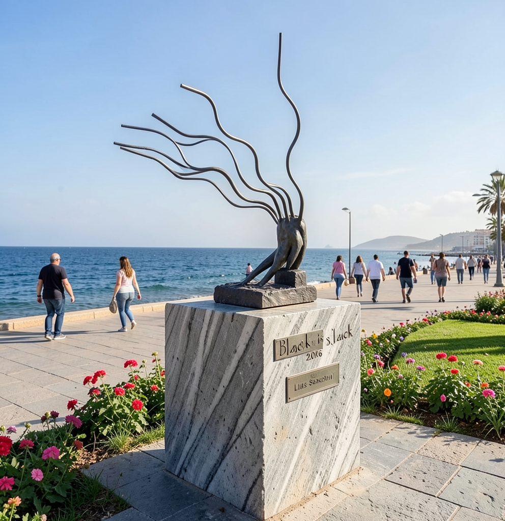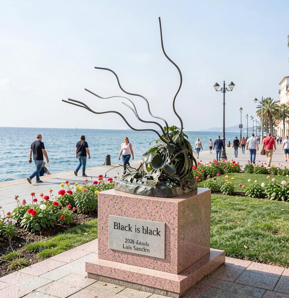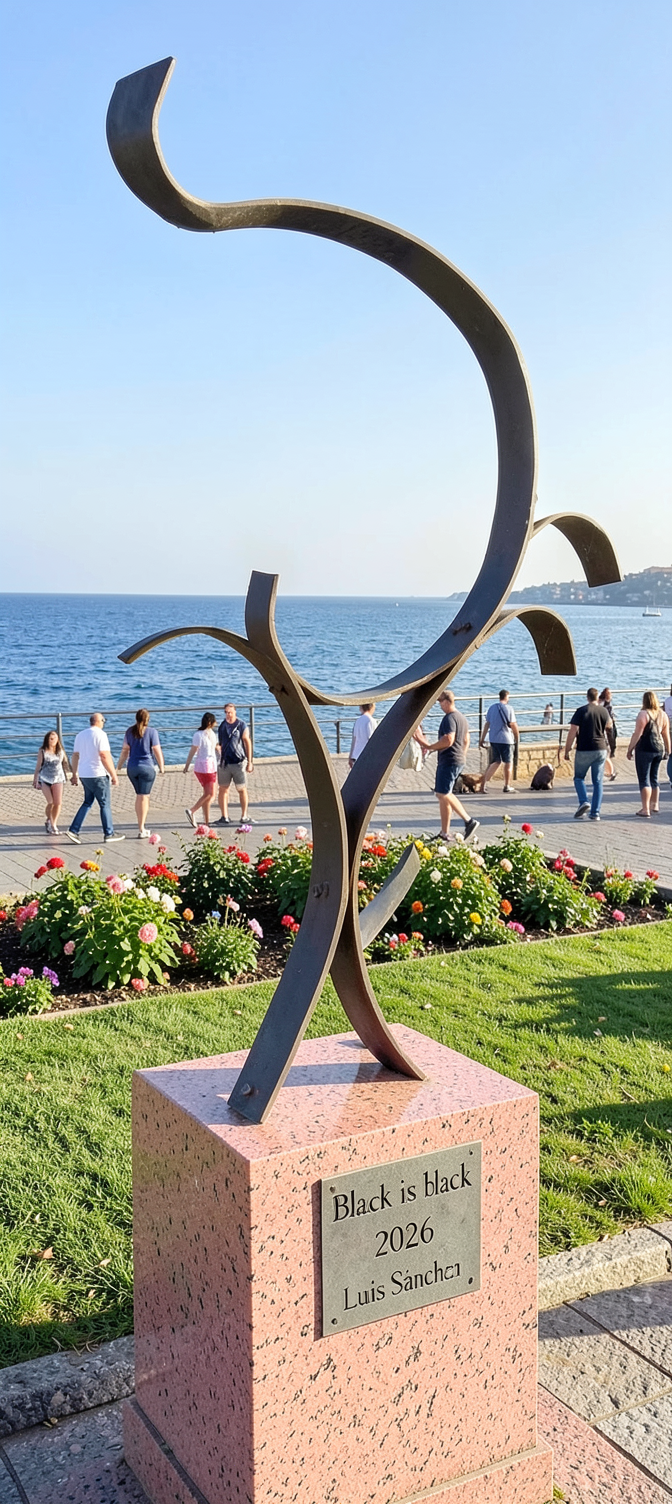 place the sculpture on a pedestal of green stone of mog n and a plaque that says black is black 2026 luis s nchez on a seafront promenade with people strolling and a garden with flowers and grass around the statue