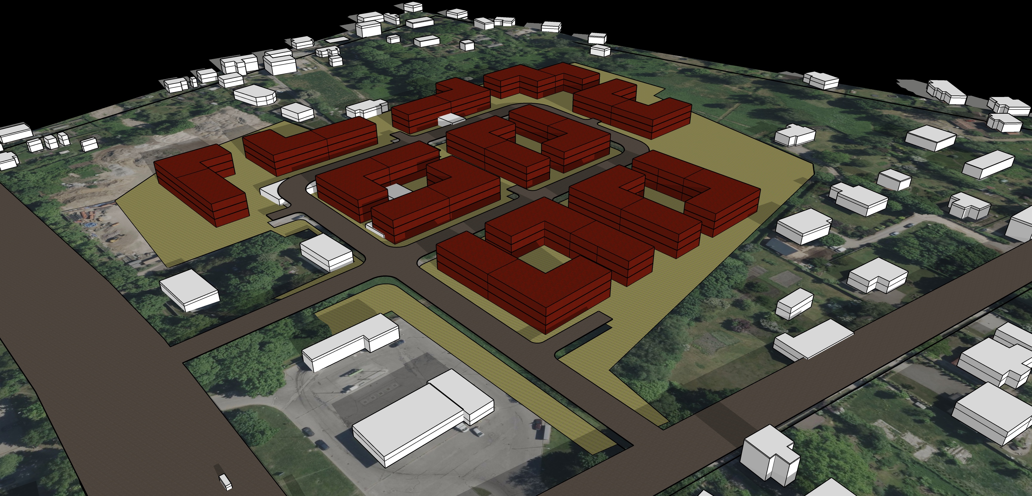 transform the provided urban massing model into a high quality architectural rendering contemporary residential development mid rise apartment blocks arranged around shared courtyards replace solid red volumes with realistic facades warm brick light concrete and timber accents large windows recessed balconies clear floor articulation realistic materials accurate scale refined proportions add mature trees landscaped green courtyards pedestrian paths subtle street furniture cars and people for scale but restrained soft natural daylight late afternoon sun long shadows slightly warm tone camera elevated oblique aerial view architectural visualization style photorealistic sharp clean professional real estate developer presentation no diagram colors no flat shading no abstract forms ultra high resolution realistic lighting global illumination physically based rendering
