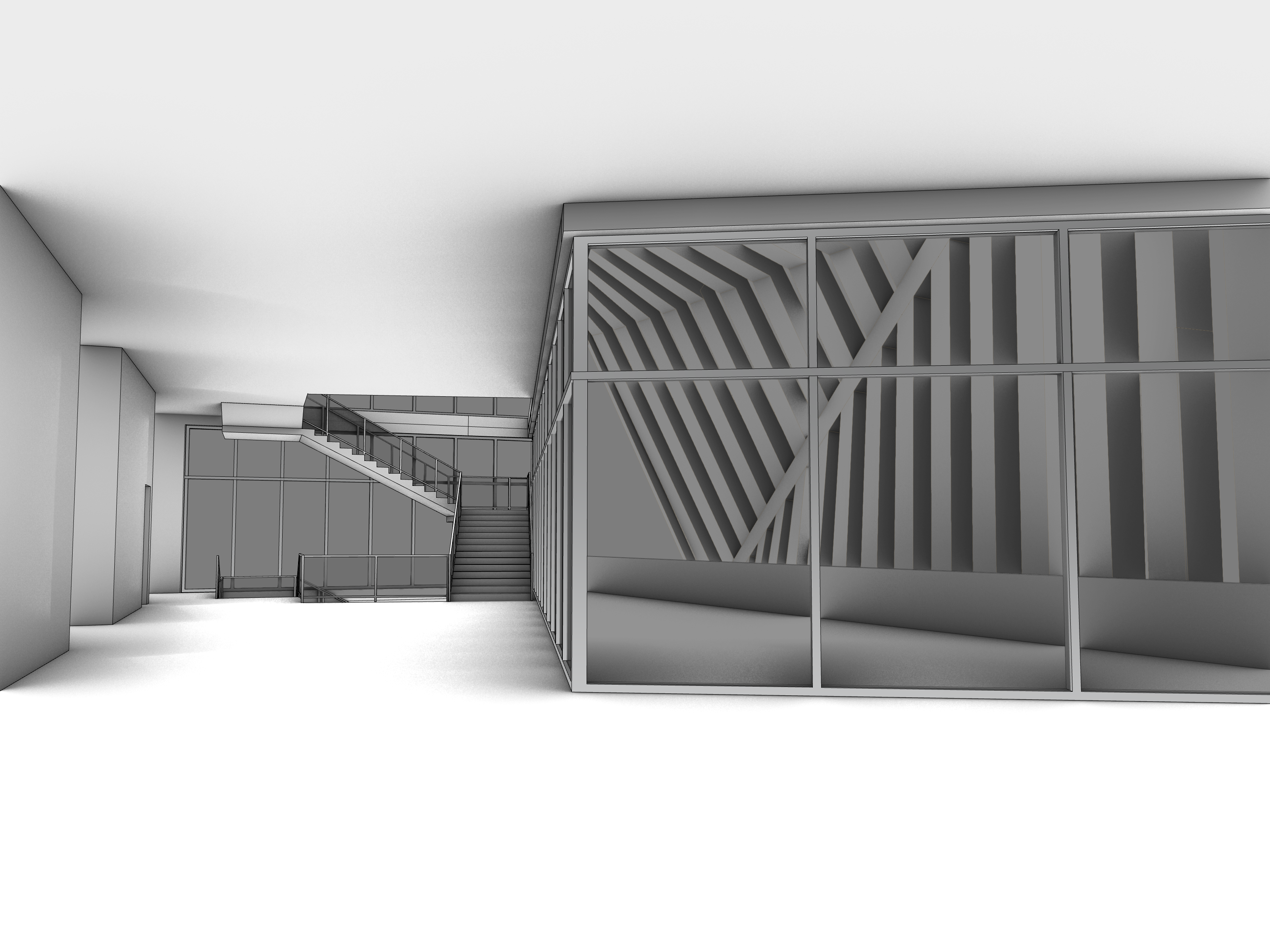 keep all geometry exactly as modeled remove all exterior buildings and replace the background outside the windows with a clean sky only use a soft gradient sky with light clouds and warm daylight do not include any skyline cityscape landscape trees or structures the background must be only sky keep the interior materials the same medium tone concrete ceiling warm tile floor and light neutral walls preserve the metal frames and structural fins exactly as they appear use soft warm sunlight entering from the windows with long shadows do not alter the camera angle or add objects