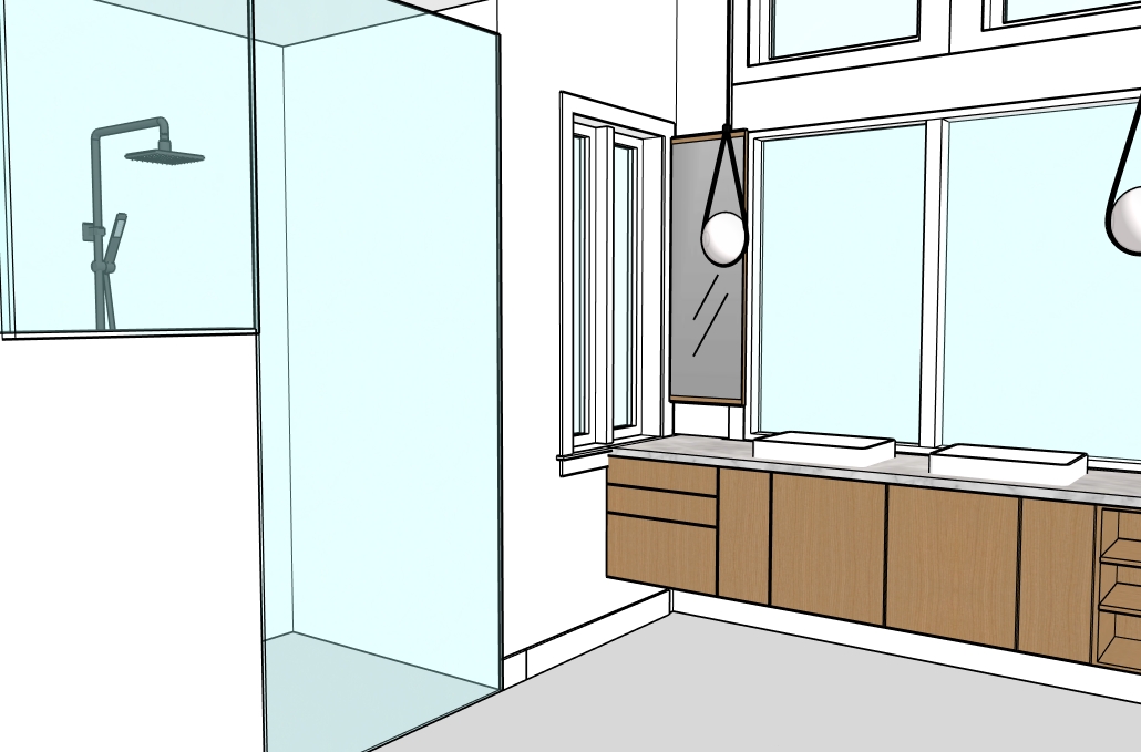 master bathroom add deck mount faucets to vanities mirror is in the corner subtle grey floor tile walk in shower