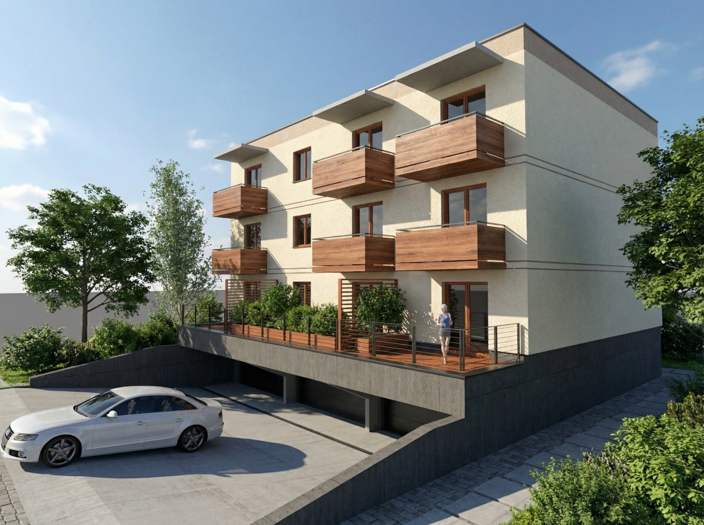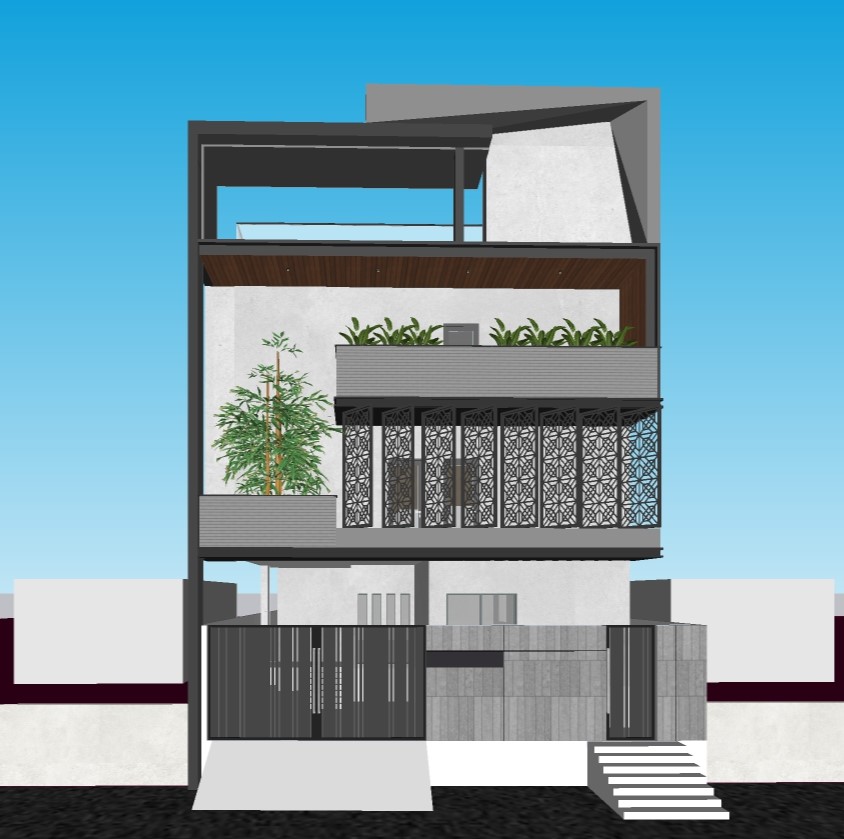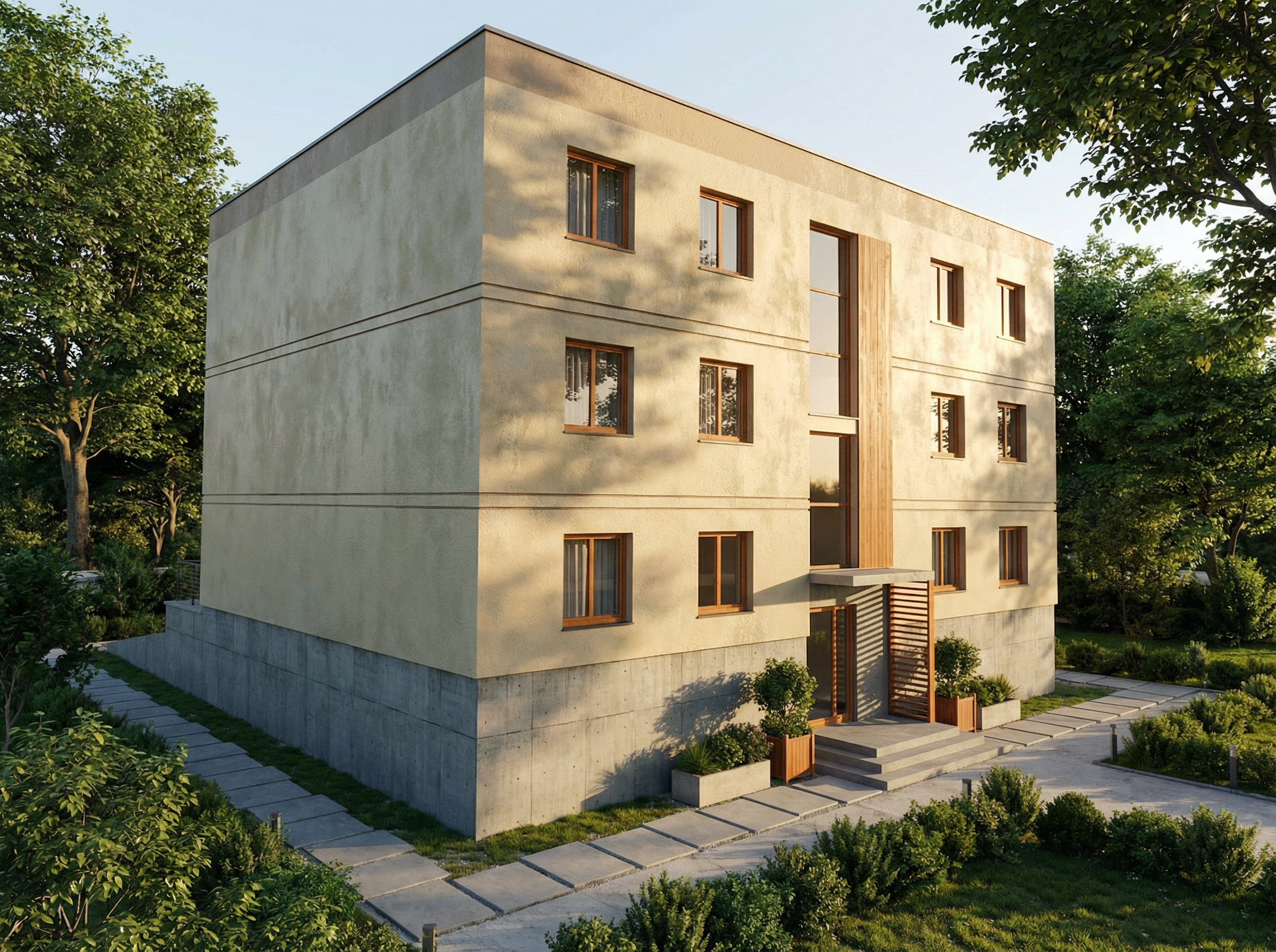 create a highly realistic architectural elevation render of the building exactly as provided do not modify or replace any existing materials colors textures or finishes applied to the fa ade preserve all architectural elements proportions and surface details accurately use natural daylight lighting with balanced exposure soft realistic shadows and correct light falloff to enhance depth and realism apply neutral color grading with true to life tones controlled contrast and accurate reflections include a realistic sky backdrop and subtle environmental context soft greenery if already present without overpowering the elevation ensure sharp detailing realistic material response to light and a clean professional visualization suitable for architectural presentation