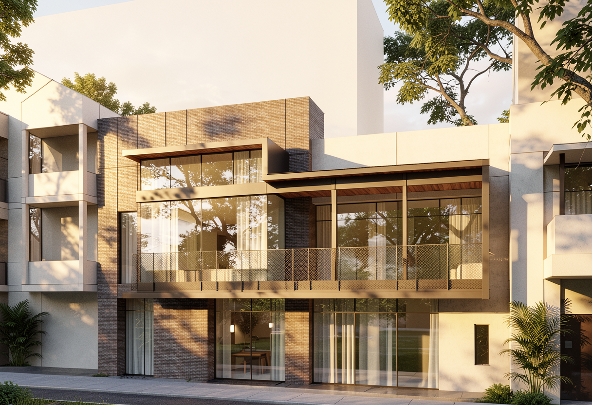 nighttime wall sconces with downward light only no upward emission soft shadows concealed lighting under pergolas linear and subtle small steplights along pathways low intensity mounted close to the ground rhythmic repetition gentle planting accent no strong uplights slightly enhanced entrance lighting dark night sky calm refined atmosphere