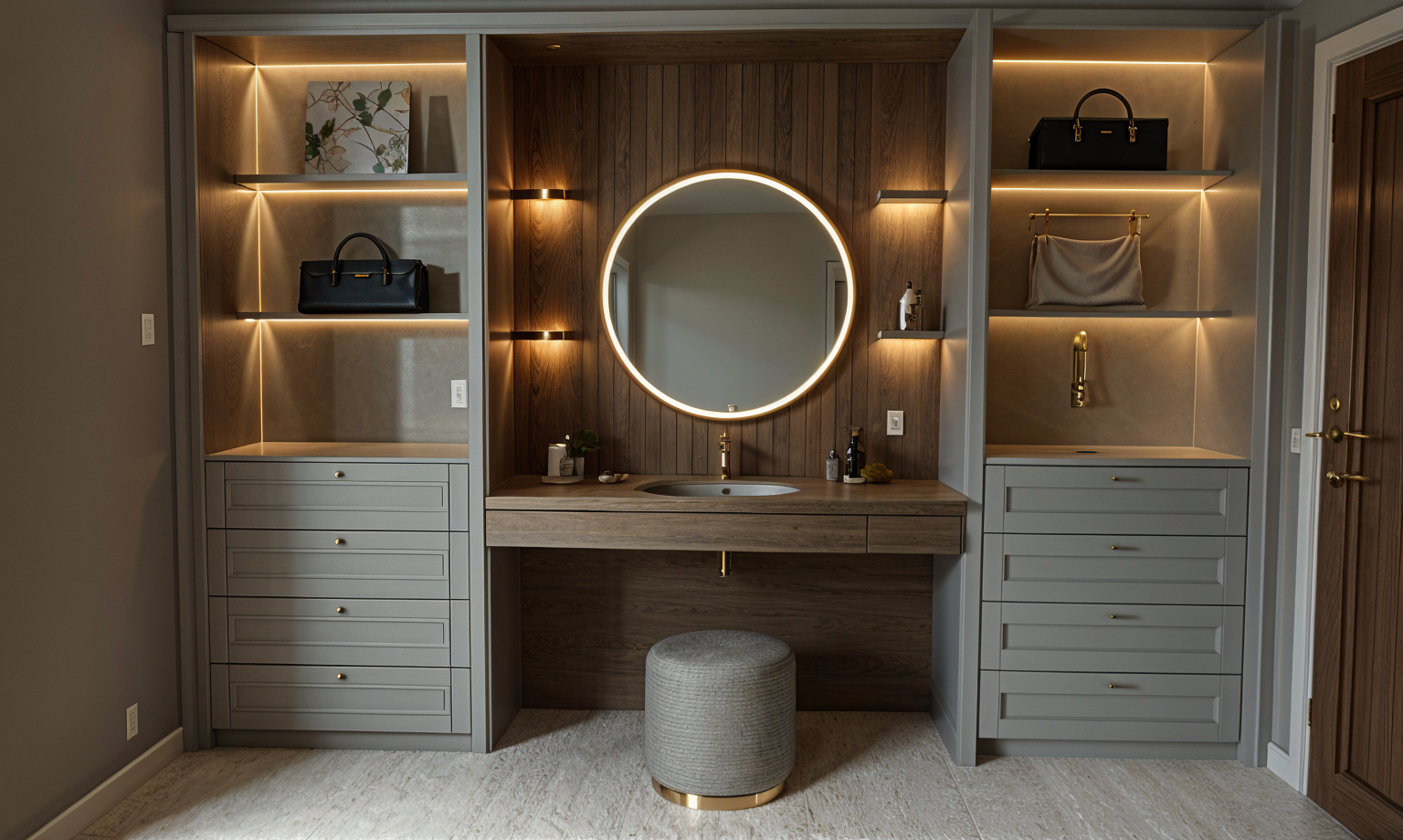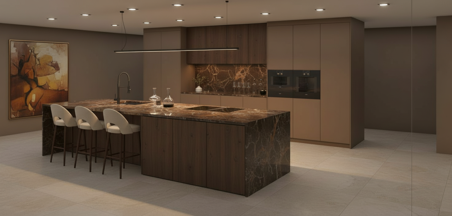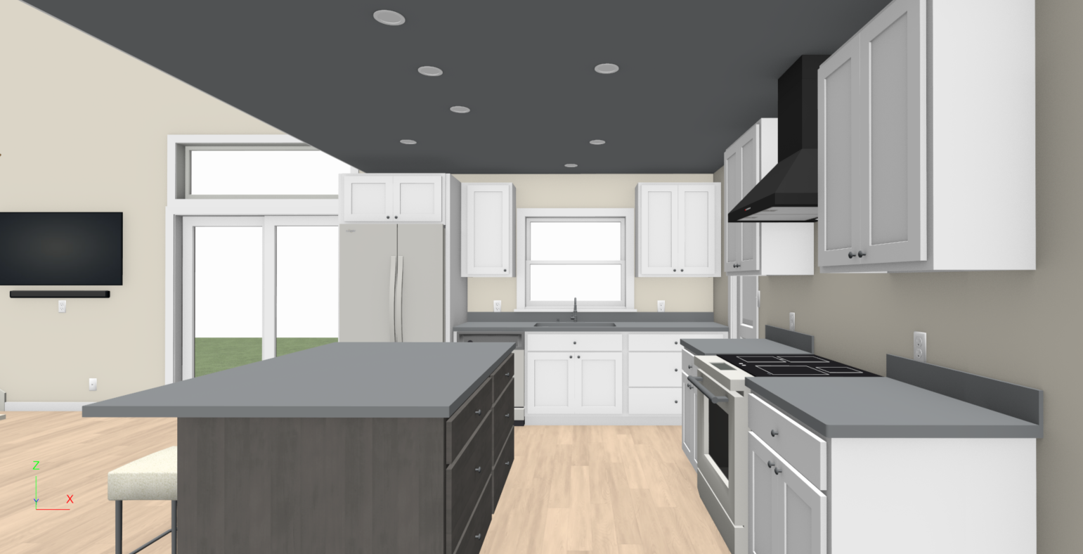 create a high resolution ultra realistic image of a modern kitchen interior retain all existing design features exactly as shown including the white shaker style cabinets dark gray countertops stainless steel appliances black range hood and matching gray island base the ceiling should remain dark charcoal with evenly aligned recessed pin lights keep the natural wood flooring beige wall color and the layout visible through the window and sliding glass doors use realistic textures for all materials metal paint wood and stone and ensure lifelike lighting that softly diffuses across surfaces for a clean professional architectural visualization finish architecture