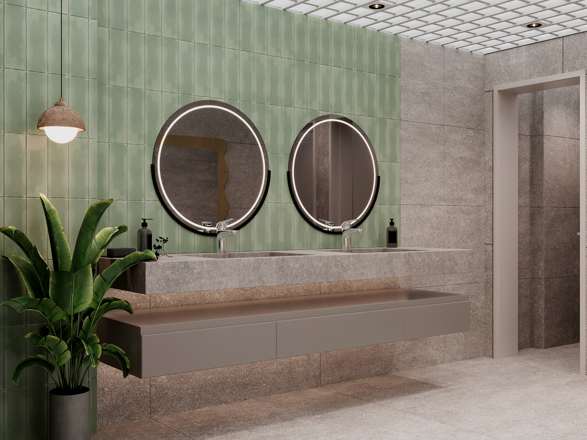 on the wall where only green ceramic is visible make the gradient green color appear as a single row of the same tone of green