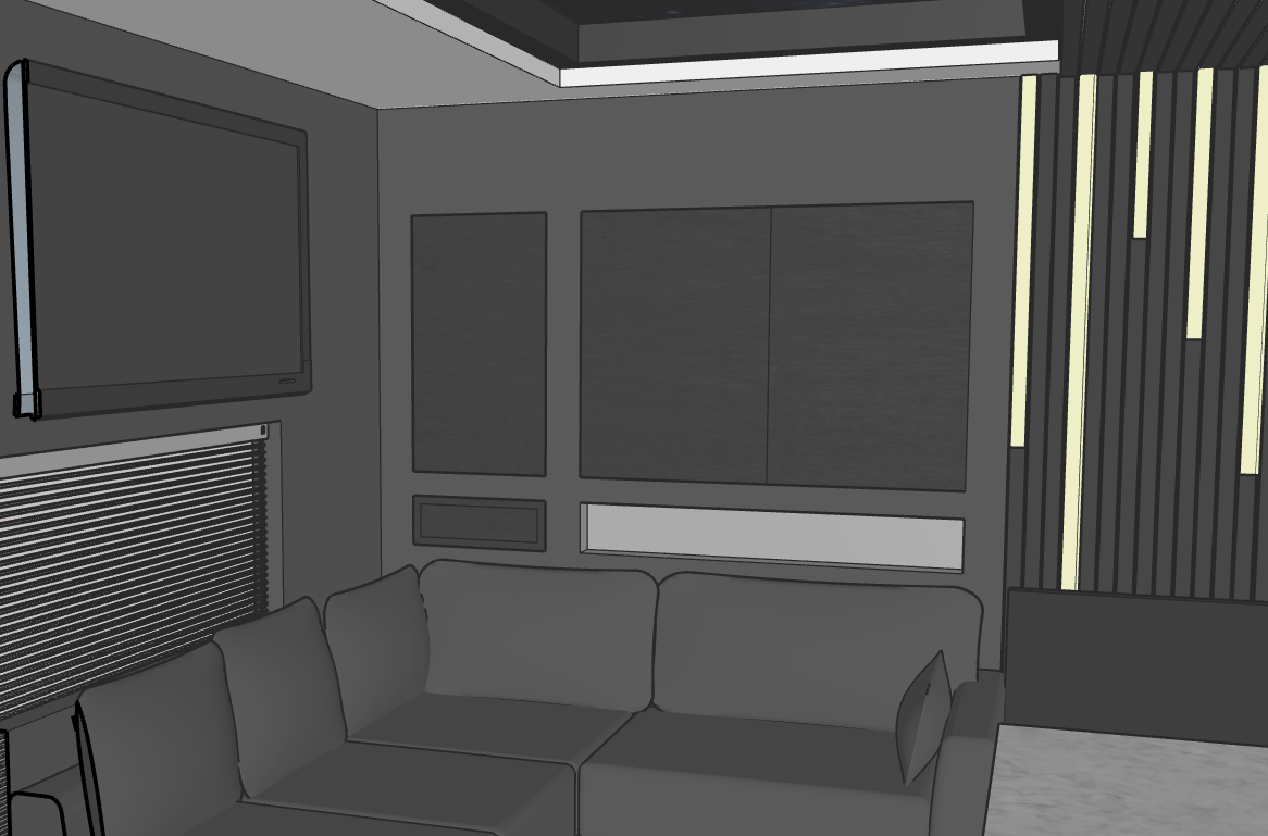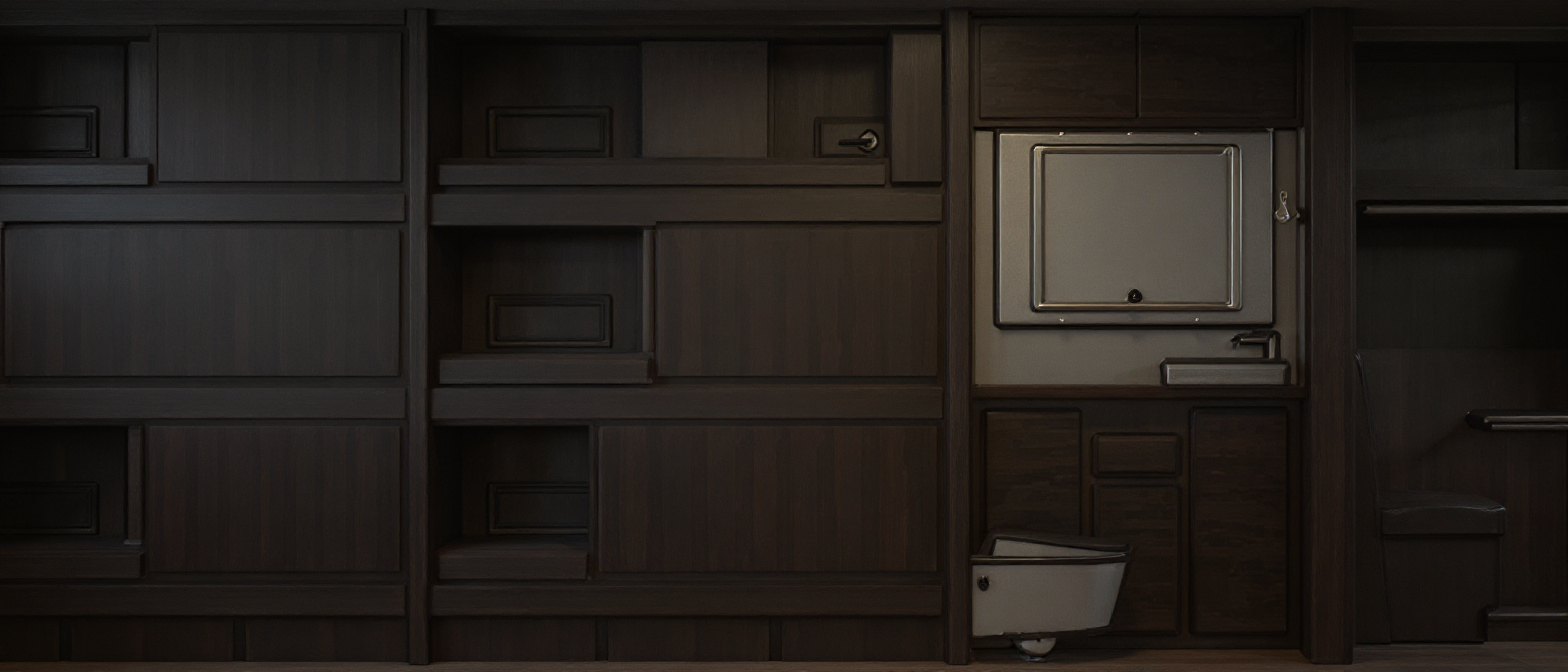 back of a tour bus black cabinetyr and seatings with dark grey walls thye yellow strips is a led light