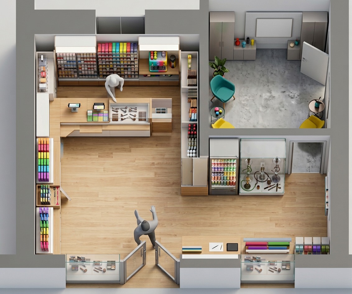 add two white armchairs and one round top table in front of the box