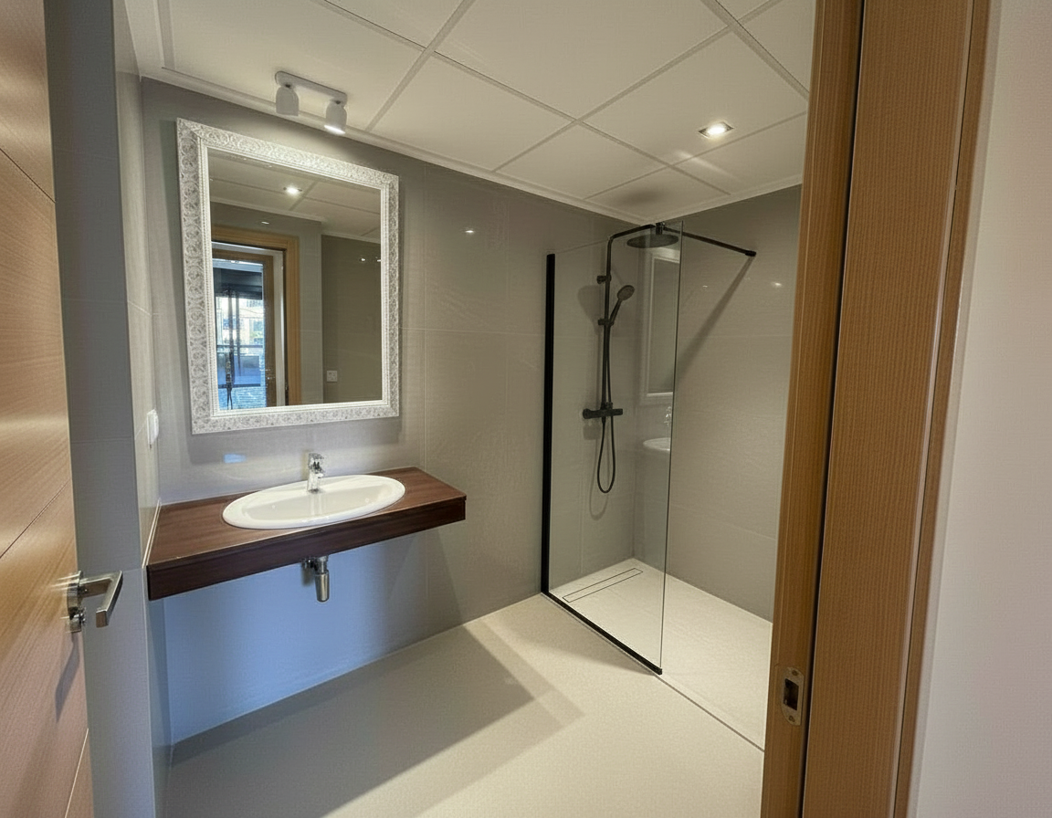 quita el lavabo y su suporte y genera en el mismo lugar un mueble en microcemento con dos lavabos sobre el mueble y con grifer a negra