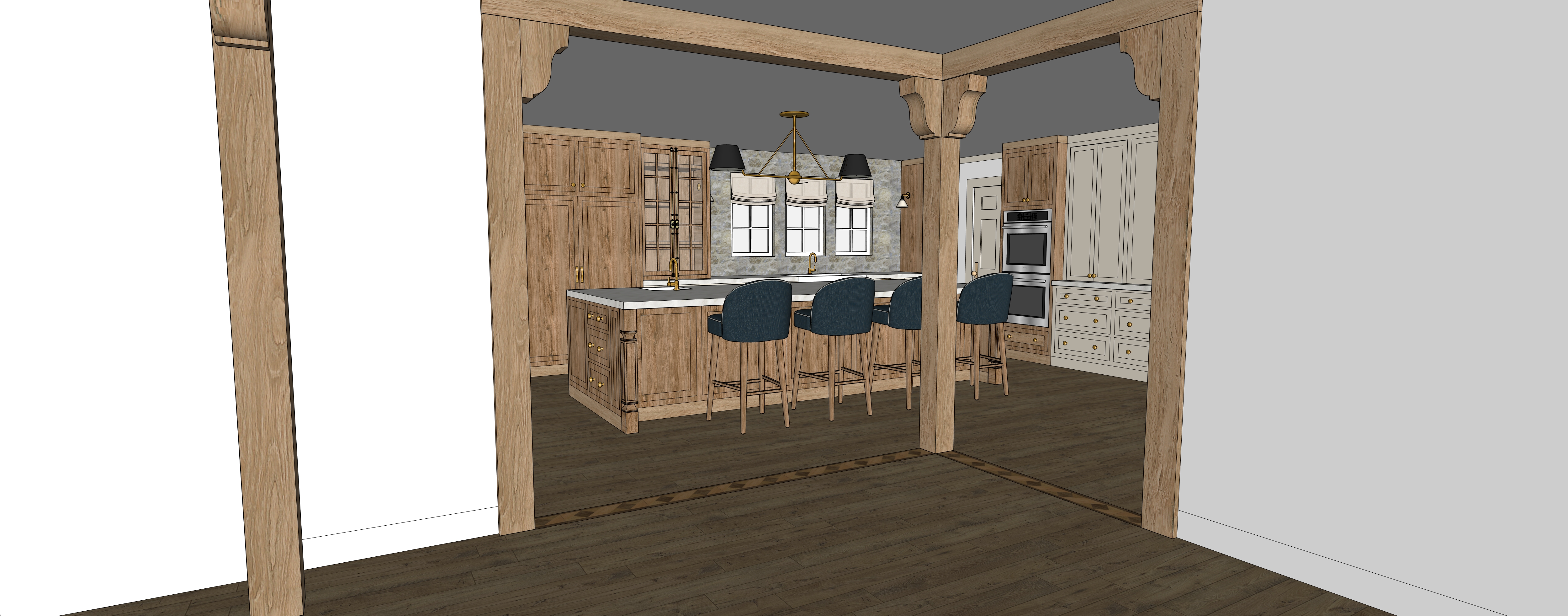 create a highly photorealistic rendering of a traditional kitchen viewed through a wood column opening using the provided image as a fixed architectural model maintain all geometry exactly as shown columns beams cabinetry layout island placement barstools lighting fixtures windows and camera perspective must not change this is a fully resolved finishes rendering with a warm layered lived in feel overall mood warm serene refined and slightly moody feels like a professionally photographed custom home strong material contrast with balanced softness architecture to preserve exactly wood columns and decorative brackets in foreground ceiling beams and proportions island size leg detailing and placement barstool placement and spacing window and cabinetry layout range wall and hood tile placement lighting fixture locations no shifts no redesign materials wood critical currently too flat warm natural white oak tone add visible grain tonal variation knots and slight aging matte to low sheen finish columns beams slightly richer and deeper than island wood avoid uniform tan introduce depth and variation perimeter cabinetry soft off white warm beige no yellow no gray cast matte painted finish subtle shadowing in panel profiles island natural wood with more depth than current slightly darker than columns for contrast turned legs should show subtle wear shadowing at joints countertops honed marble soft veining in warm gray taupe tones matte finish no gloss no sharp reflections hardware plumbing aged brass warm muted patina no shine no bright gold barstools deep blue green upholstery rich slightly muted matte woven texture wood legs with subtle variation lighting biggest upgrade needed natural light soft daylight entering from windows slightly diffused no harsh sun beams exterior should hint at greenery interior lighting warm ambient fill 3000 3500k pendants softly glowing not bright not blown out no harsh downlighting shadow control fixing current issues add grounded shadows under island legs the island must feel anchored to the floor no floating introduce contact shadows at all floor connections soft shadow gradients under cabinetry slight deepening under island overhang light balance no hotspots on countertops or tile no overly bright ceiling gentle contrast between foreground columns and kitchen beyond camera settings eye level 5 ft 28 35mm lens maintain current perspective framed by columns high dynamic range 4k 8k resolution realism boosters critical add ambient occlusion where columns meet floor where cabinets meet walls under toe kicks introduce micro variation wood tone shifts slight sheen differences subtle imperfections add light falloff from foreground to background columns slightly darker kitchen softly illuminated