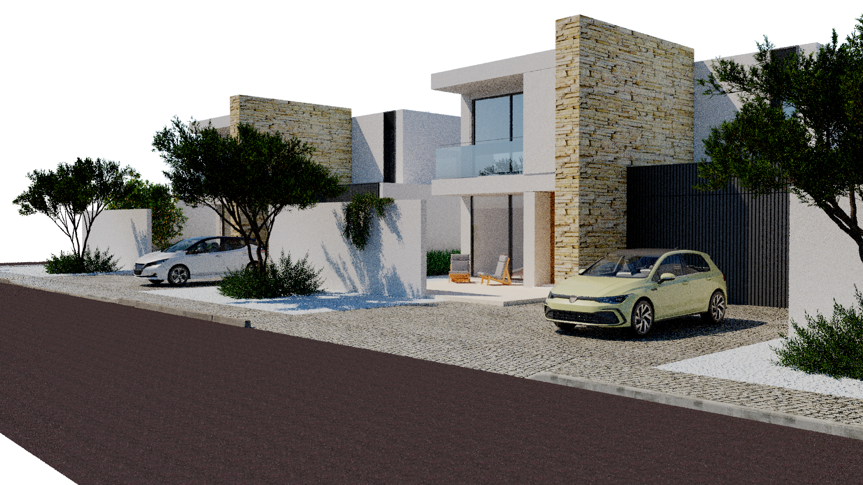 type of image ultra realistic architectural editorial photograph high end residential project archsynth style visualization scene framing street level perspective slightly low angle 3 4 frontal view of two contemporary mediterranean villas wide horizontal framing foreground includes asphalt road and cobblestone pedestrian area natural depth leading towards background landscape architecture elements modern cubic villas with clean volumes combination of white rendered walls and warm beige natural stone cladding thicker window frames visible depth and shadow dark aluminum finish large sliding glass panels with clear reflections covered entrance porch with minimalist outdoor furniture wood neutral fabrics carport with vertical dark slatted metal screen two parked modern compact cars subtle not dominant materiality white fa ades with subtle monolayer render effect slightly textured matte not overly rough natural stone cladding with horizontal stratification warm tones cobblestone pavement in light beige tones gravel garden areas replacing traditional grass mediterranean xeriscape concrete elements smooth but slightly weathered landscape design dry mediterranean garden with gravel base scattered low shrubs olive trees with light airy foliage background flat mediterranean terrain transitioning into distant soft mountains add sparse pine trees not too dense elongated trunks light canopy minimal vegetation density clean and controlled composition lighting natural sunlight late morning or early afternoon soft shadows slightly warm tone balanced exposure no harsh contrast subtle global illumination with realistic light bounce on white surfaces color texture neutral and warm palette whites beige sand olive green slight desaturation for editorial realism micro texture visible on walls stone and pavement no over saturation cinematic subtle grading atmosphere calm refined mediterranean lifestyle mood slight atmospheric haze in the background for depth clean air no dramatic sky style architectural digest style contemporary european editorial photography photorealistic not stylized cgi lens 35mm realistic depth of field sharp focus across main plane quality rendering ultra detailed 8k resolution physically accurate materials soft global illumination ray tracing realistic reflections no noise no artifacts restrictions negatives no exaggerated textures no overly dramatic lighting no dense vegetation no futuristic elements no people no distortions in geometry no overexposed whites