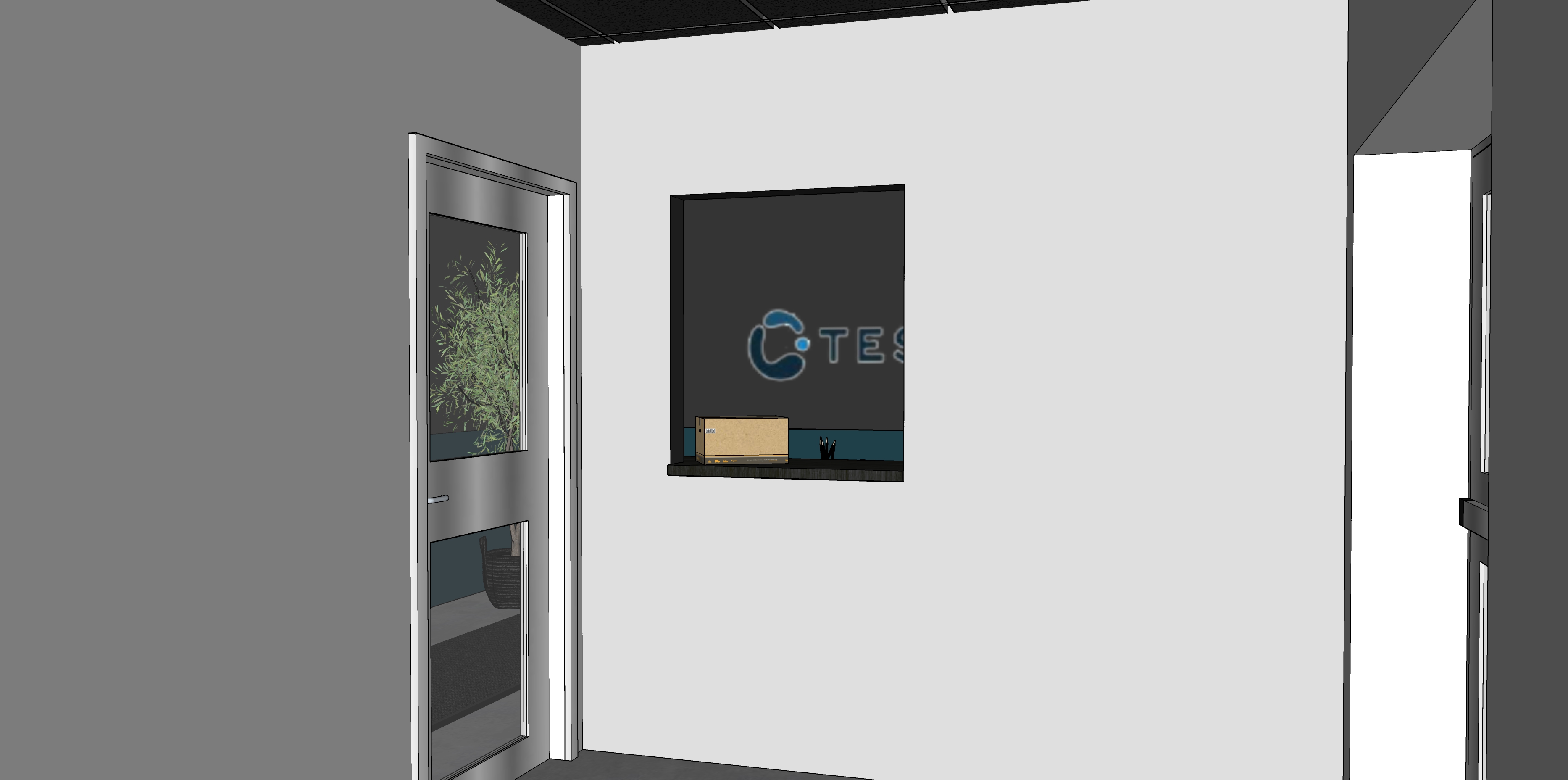 the ceiling is made of suspended tiles painted dark gray the floor is matte concrete the carpet is dark gray with a thin black rubber border there is an opening in the wall for passing packages the tesla logo on the wall is neon blue