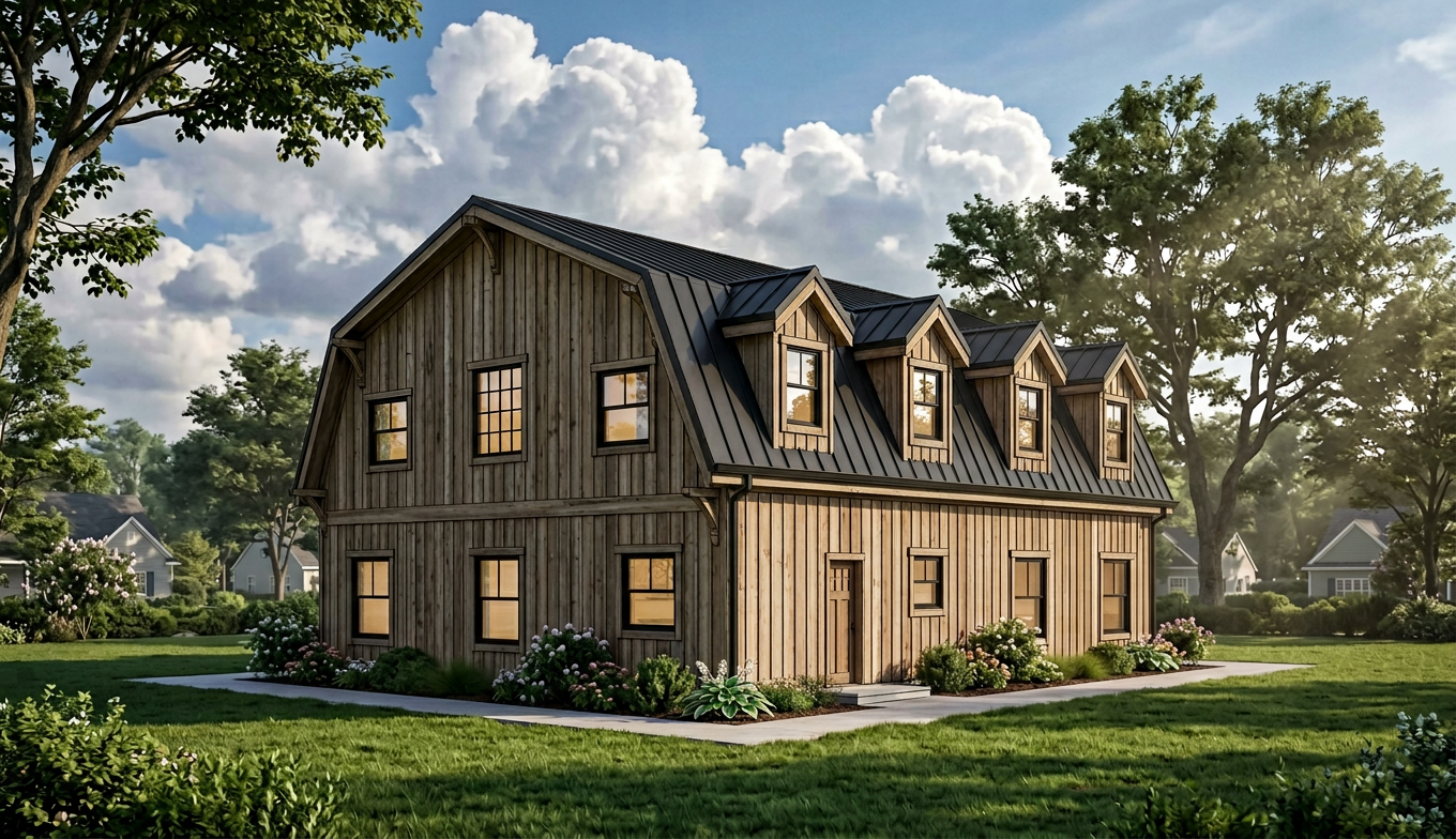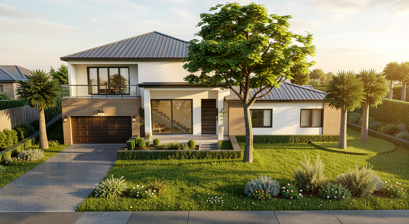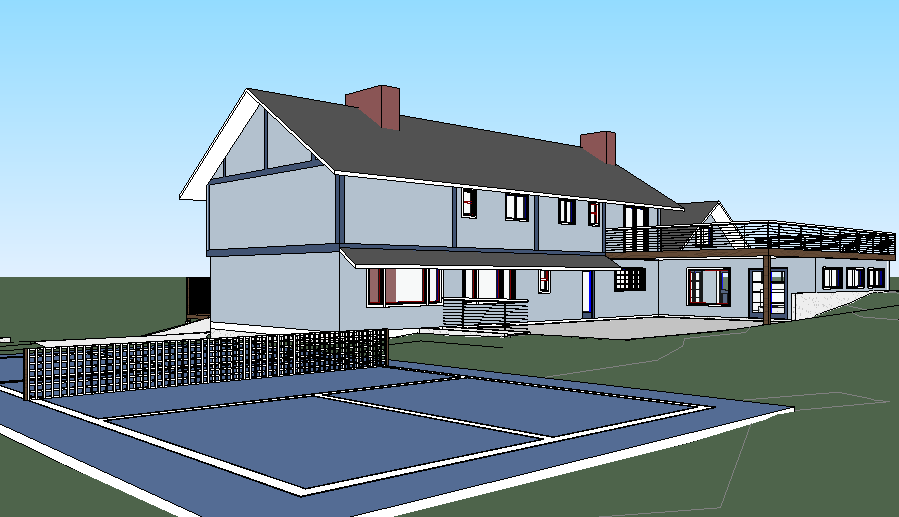 add natural lighting make look realistic the trim is dark navy blue the light blue on the house is stucco there is a pickleball court add surrounding trees and nice landscaping there is a residential road behind the building on the left