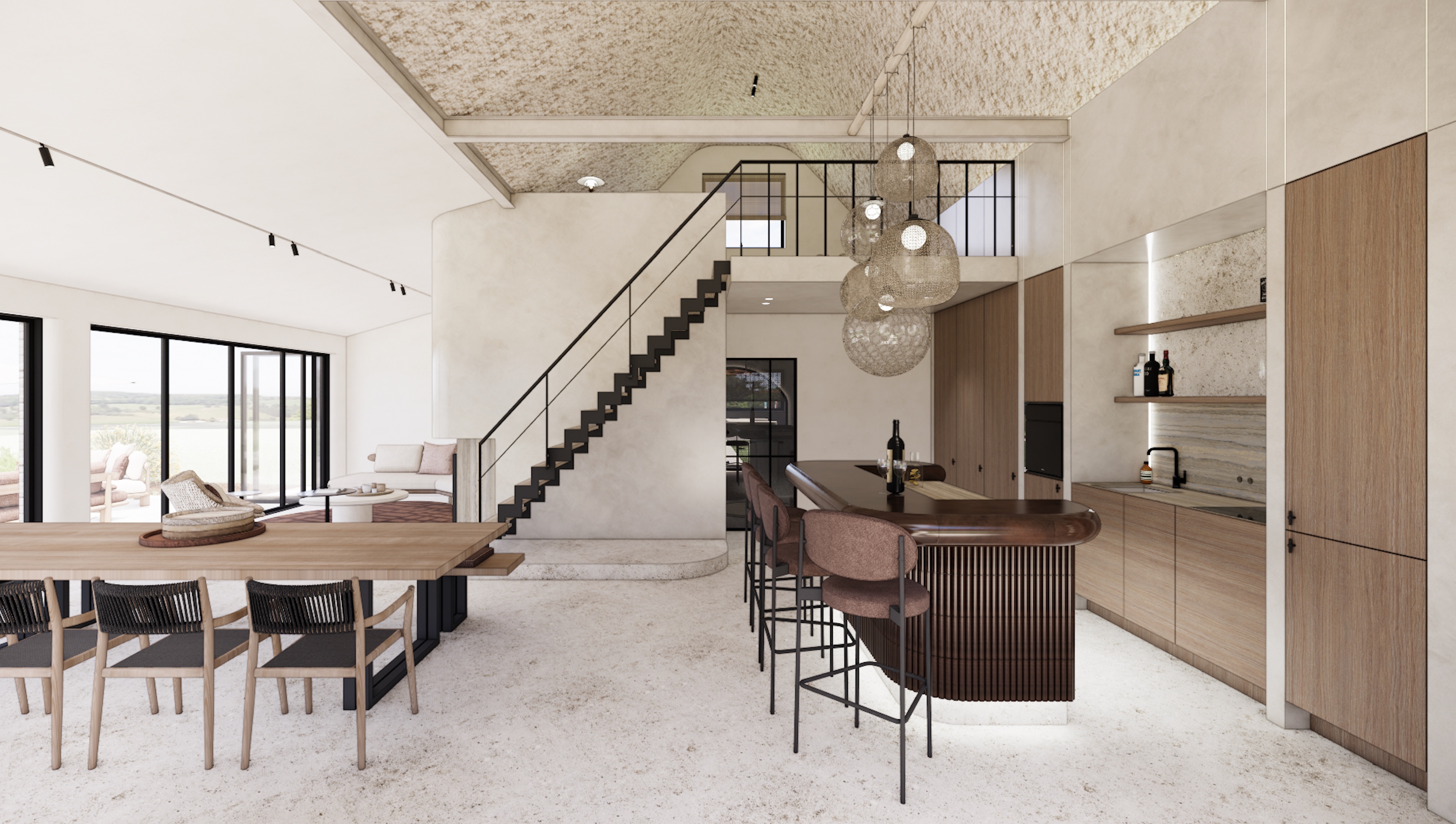 ultra photorealistic architectural interior render preserve exact camera angle composition scale and layout improve lighting material realism and depth only high end contemporary interior soft natural daylight mixed with warm artificial lighting accurate materials refined textures no exaggeration editorial quality calm and elegant atmosphere