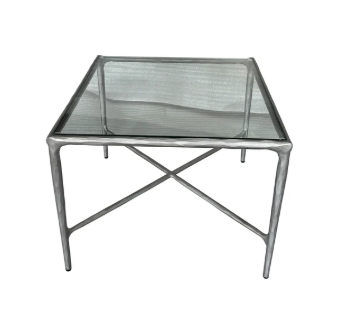 show this forged iron and glass side table directly front on