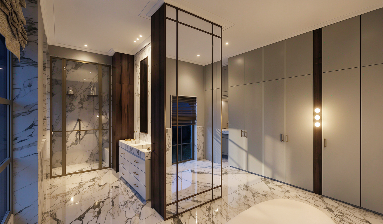luxurious monolithic bathroom with curtain surrounding it