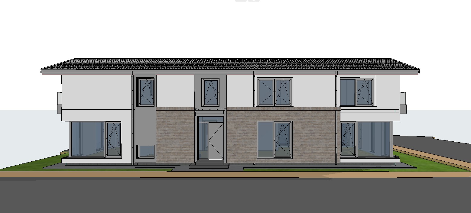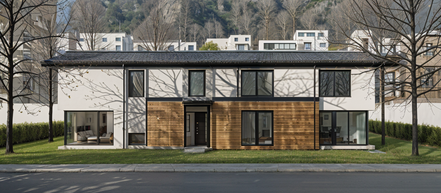 modernist exterior shot a beautifully rendered modern minimalist house set amidst a serene natural environment the house features angular wooden structures with a dark gray and black exterior large glass windows reflect the subtle hues of the surrounding landscape the wooden siding has warm earthy tones like soft browns and is combined with sleek contemporary black trimming the atmosphere is tranquil and the lighting is soft mimicking a gentle morning or late afternoon light the ground is adorned with patches of green moss and vivid yellow wildflowers adding a burst of color and life the surrounding trees are leafless drawn with delicate thin black lines indicating the late autumn season shadows of the trees create an intricate pattern on the house and the ground in varying shades of gray and brown the entire setting feels both modern and natural embracing simplicity and elegance architecture white facade keep windows from concept the background is forest please preserve the architecture and proportions of the building behind the building we neighborhood change wood texture to grey brick