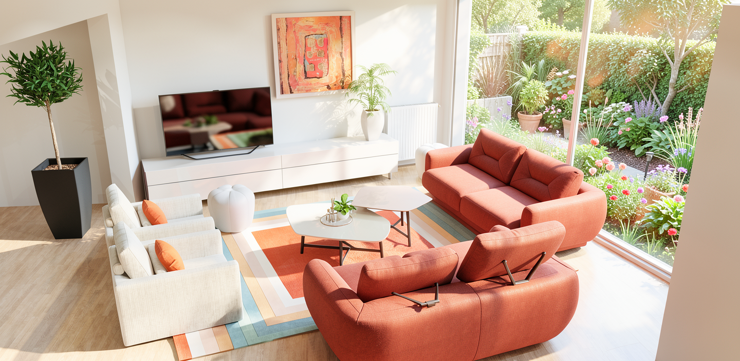 roof orange red brick color folded tile superstructure material black sheet metal reflections in the windows glass railing lots of greenery on the terrace