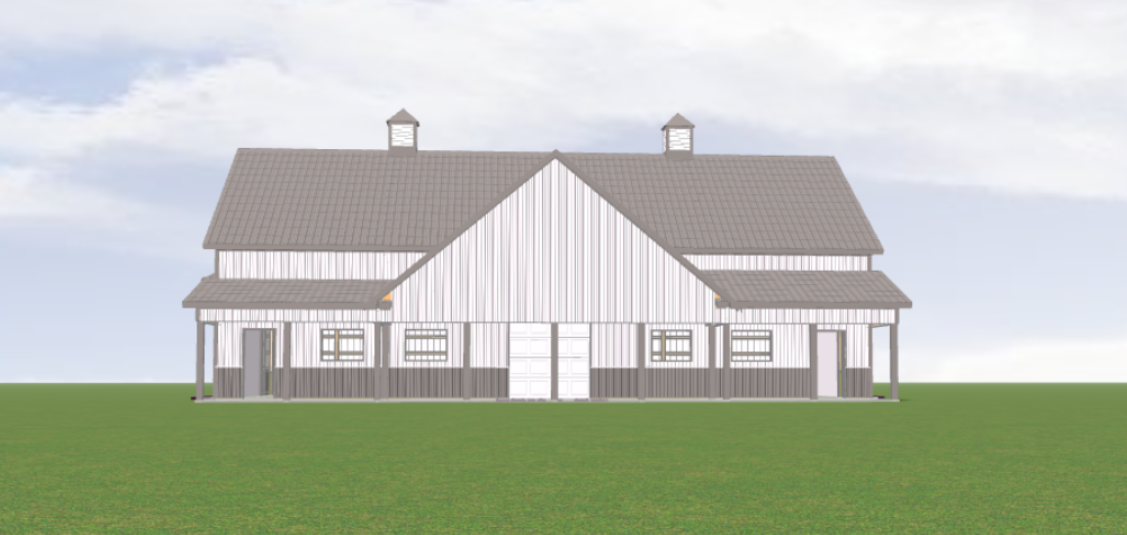 can you make this look more realistic add a cedar looking gable truss on the front porch and some rural trees in the background
