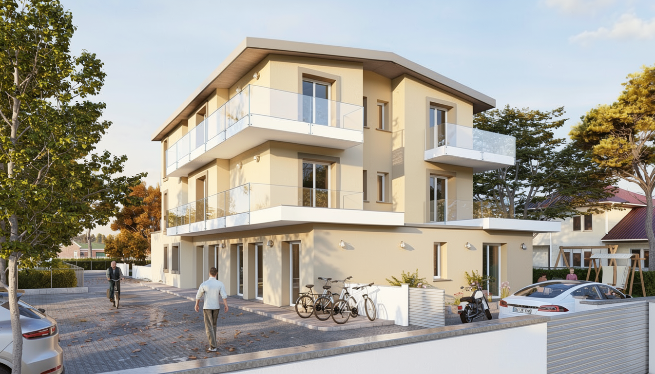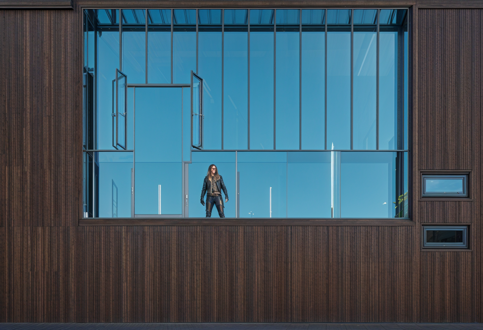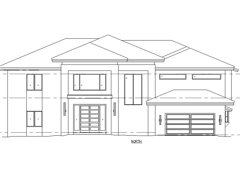 prairie style exterior shot concrete tile roof south florida landscape afternoon lighting large format tile on verical columns stucco field wood front door and garage door architecture