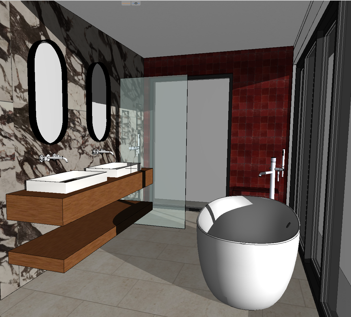 salle de bain avec marbre derriere vasque vasques pos es sur bois en noyer fonc douche avec rev tement en zellige teinte rouge bordeaux sol en travertin beige clair