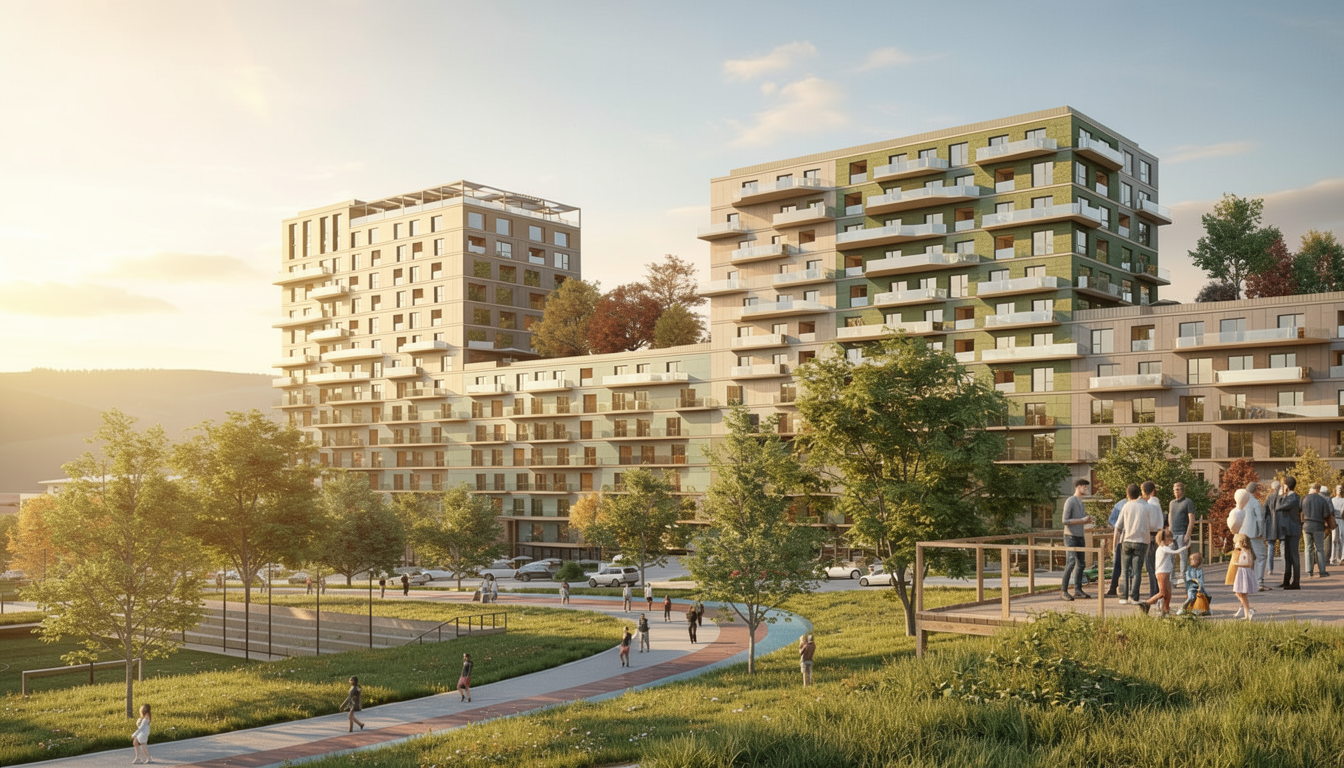 new england house shingle style natural greyd shingle with black metal roof with wooded background with river in distance