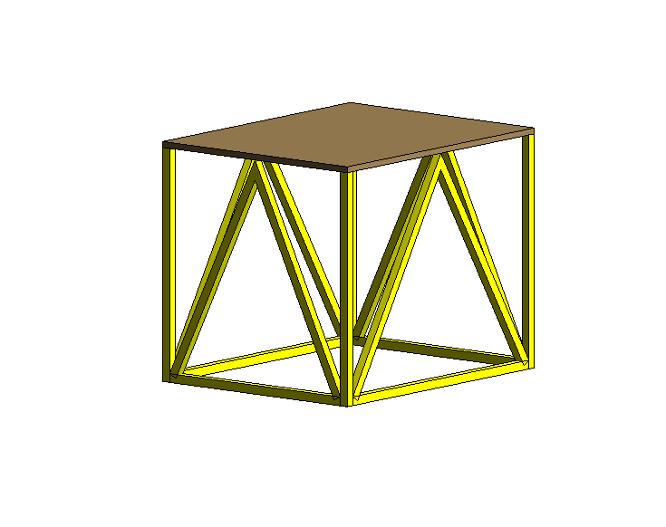 render this table keep the colours the top should be osb the legs and bracing should be solid pine painted yellow the background should be a plain background architecture