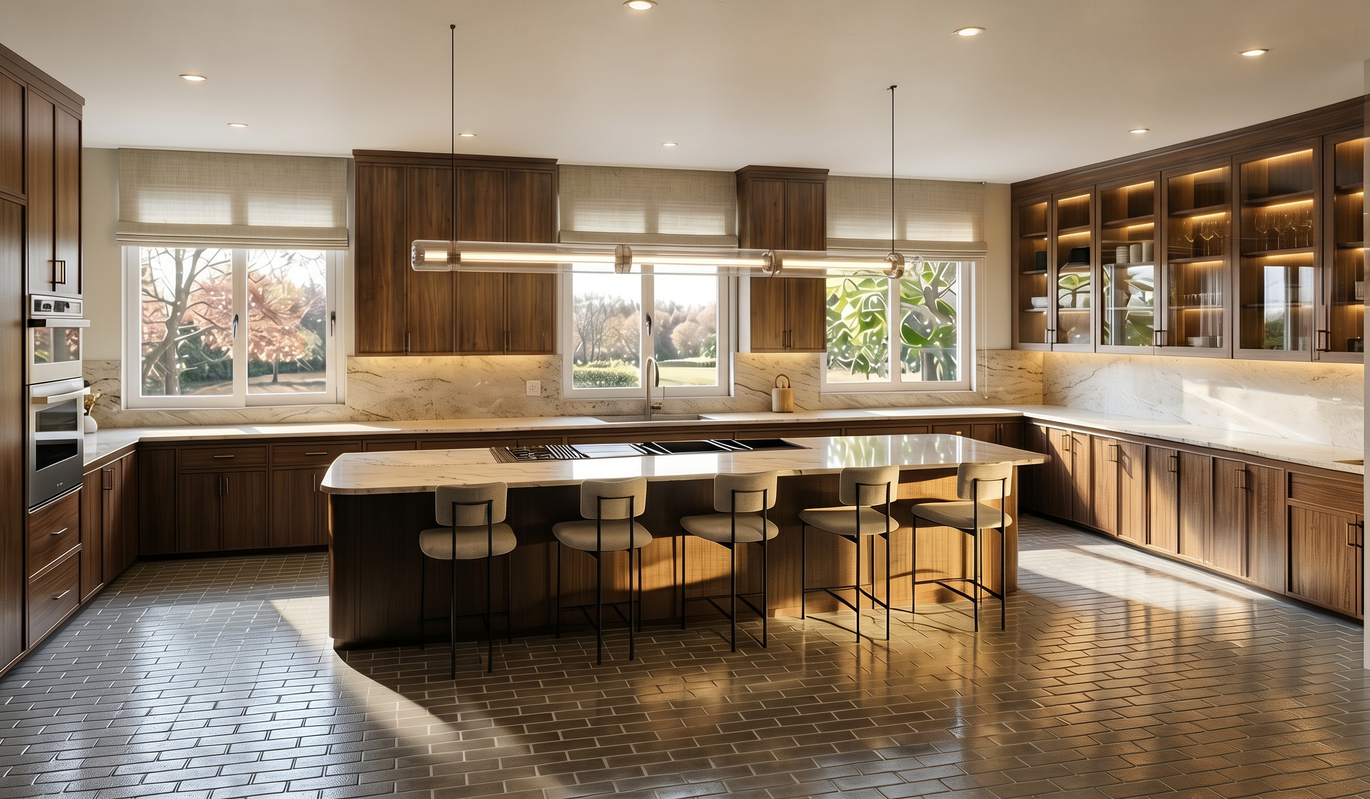 provide photo realistic landscape render early evening with subtle led lighting under stair nosings
