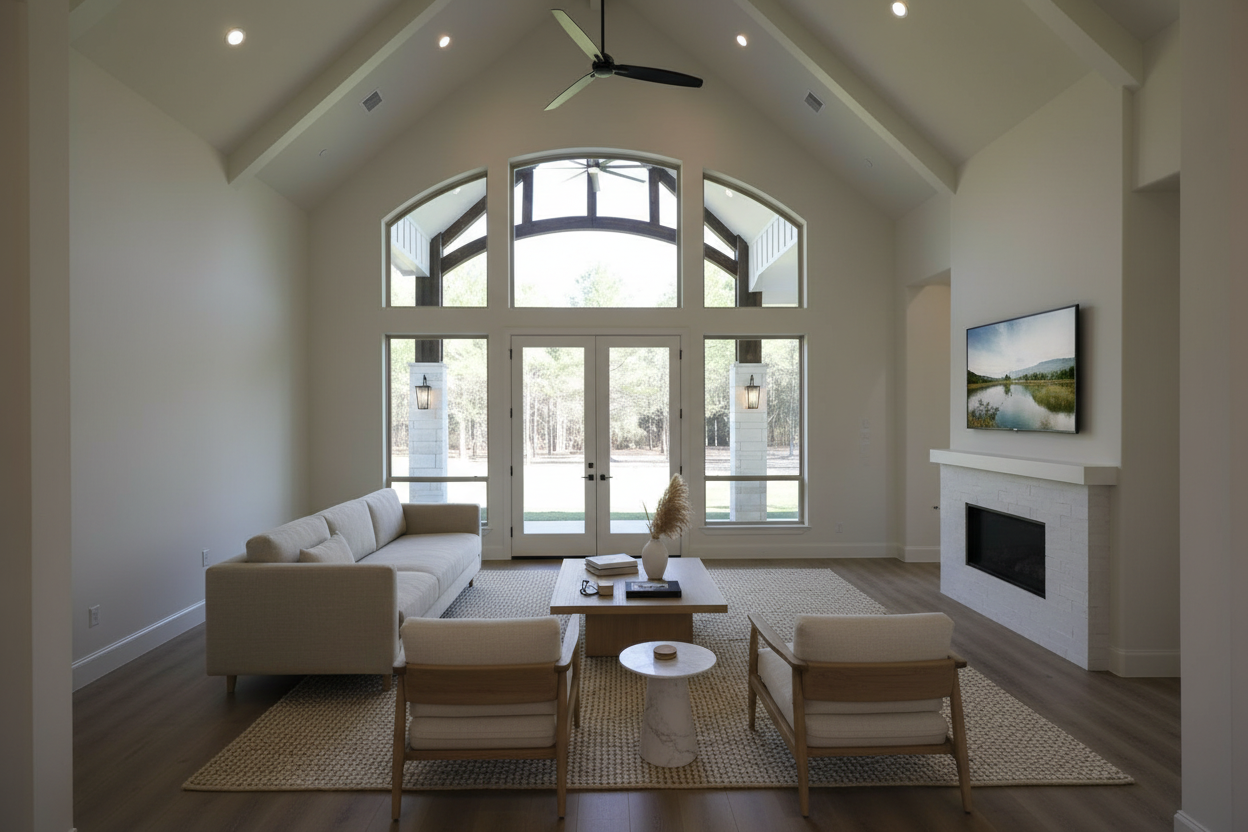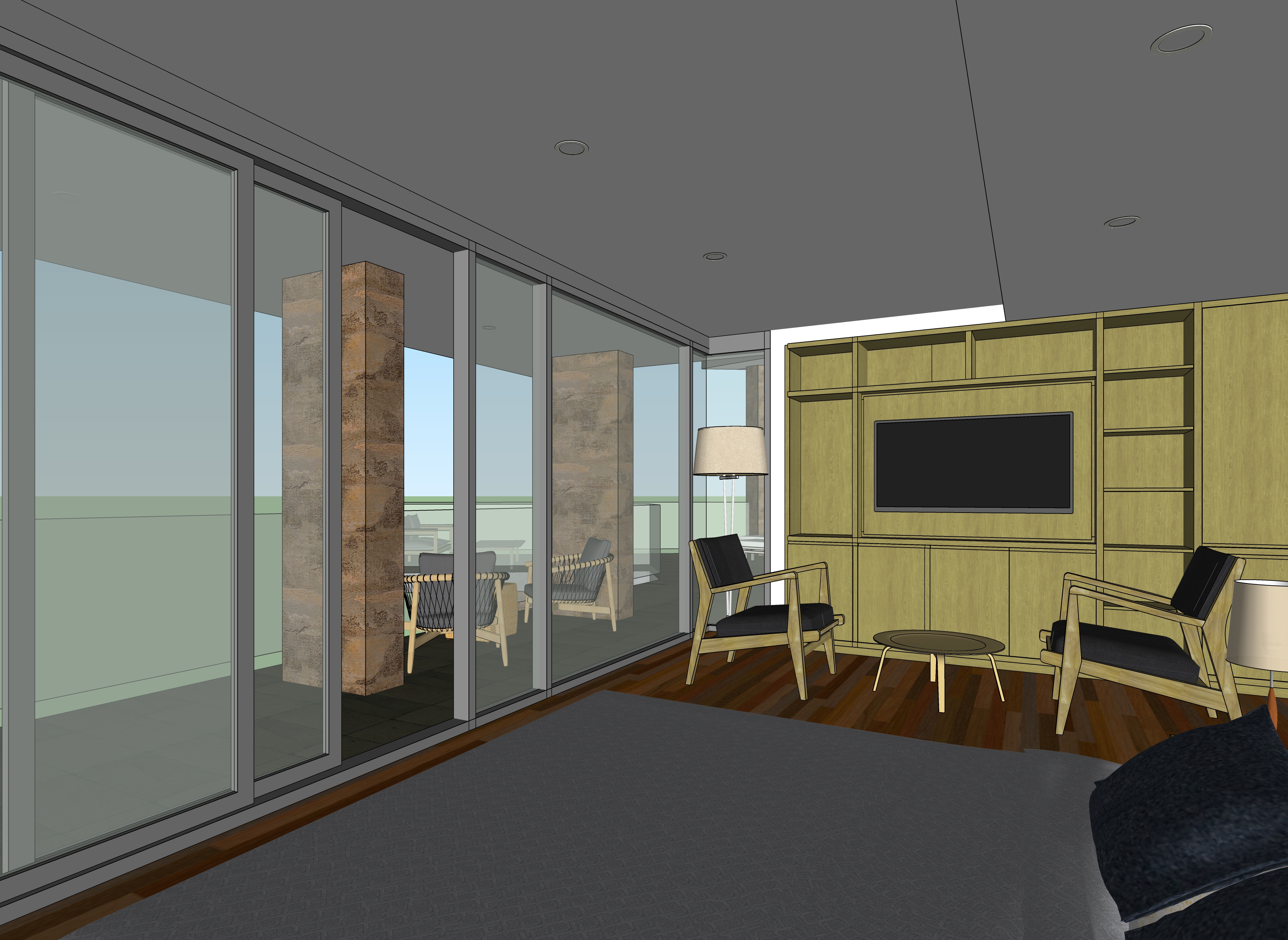 evening view in the summer with a setting sun on the horizon add light to the floor lamps and recessed lights make the view out of the windows of lake pepin from a high elevation with no trees visible below the balcony use site cast concrete for the main house material with a natural warm clay color add books and other accessories to the shelves ad an image on the flat screen of a nature movie add a woman standing on the balcony looking out towards the view with a cat sitting next to her add a hudson bay blanket draped over the foot of the bed add a man sitting in the chair on the right reading a book add led linear lights to the shelves add two sailboats on the lake