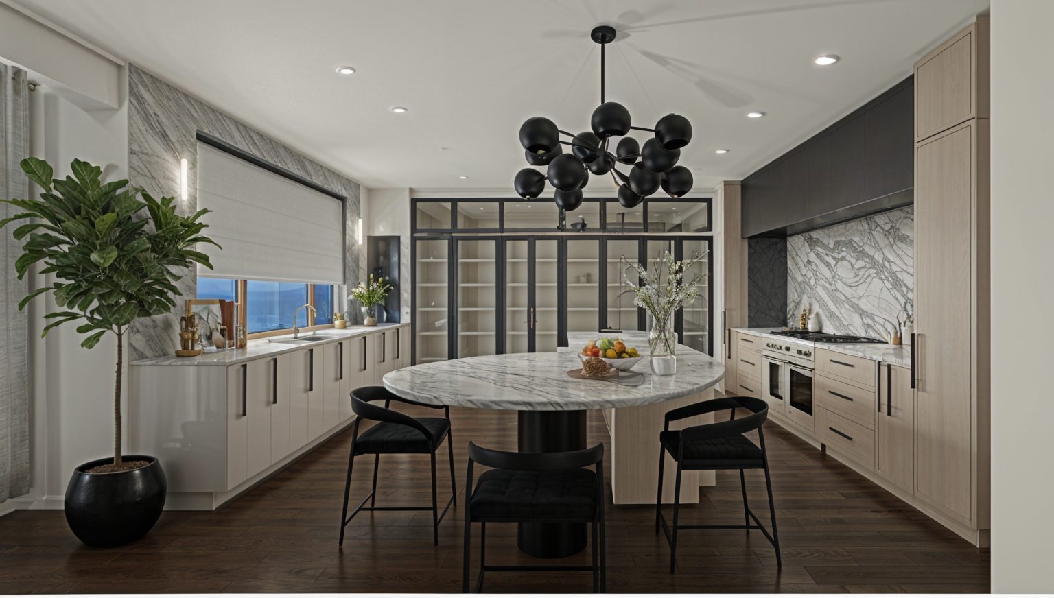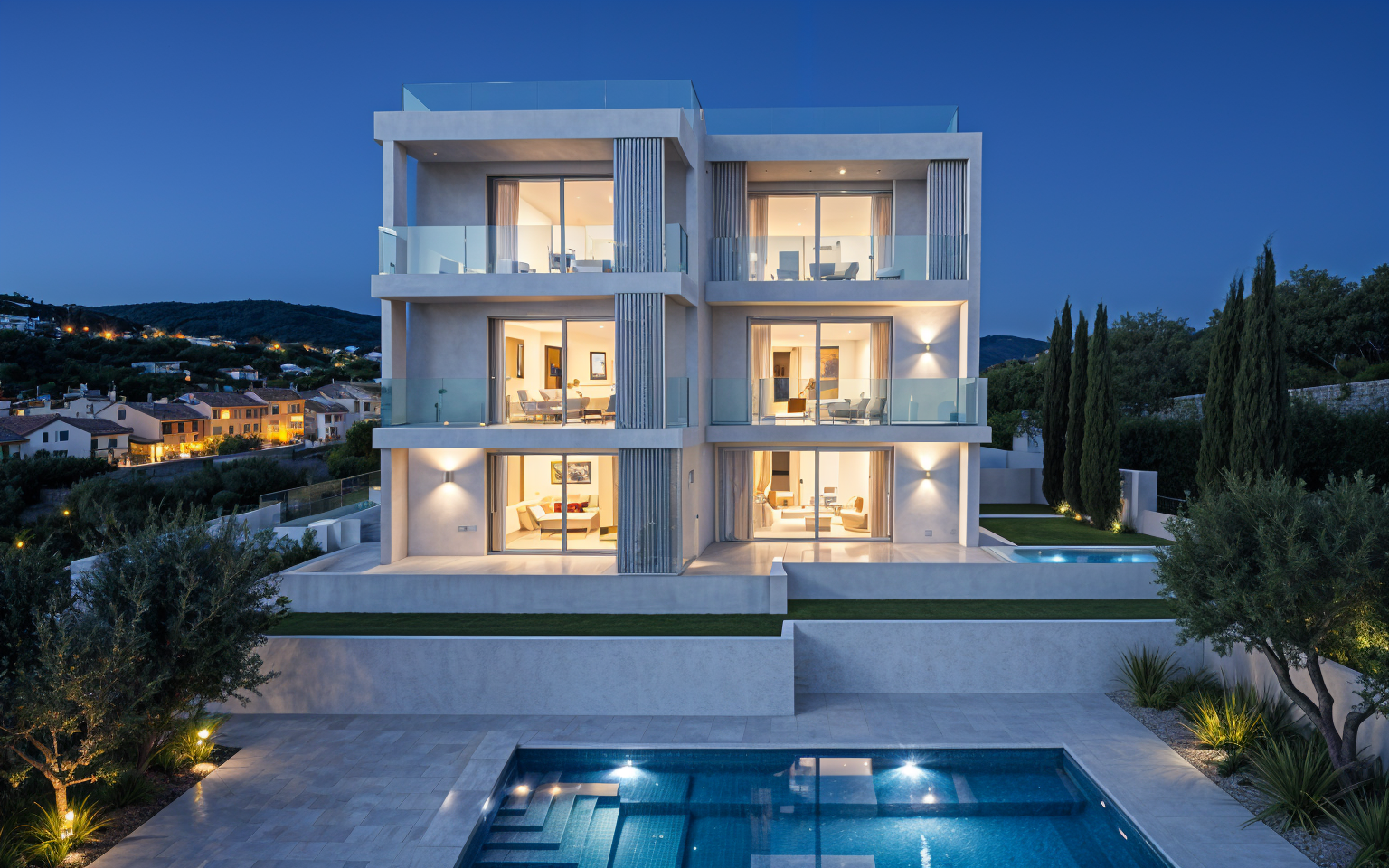 zaha hadid night shot medireranean village background olive trees and aloe veras and thujas in garden french riviera interiors in windows brass vertical stripes railings ethimo furniture grey window frames white facade grey pieces of facade brass white marble pavement shining blue mosaic pool in front of every balcony two randomly distributed floor to floor vertical striped brass panels 80 by 320 cm architecture