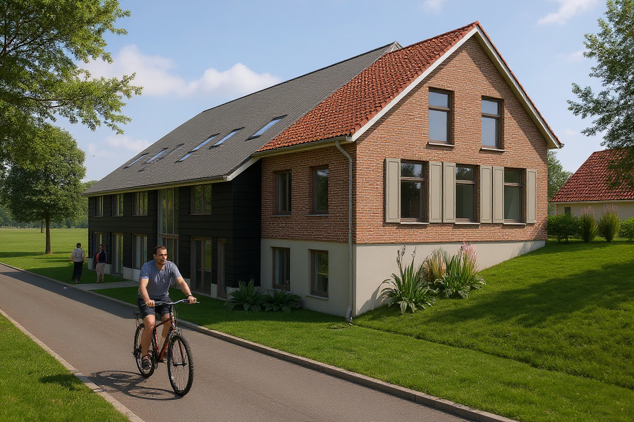 the house in the scene is surrounded by a green garden with lots of flowers and bushes there are lots of people in the scene the weather is sunny with a few clouds in the sky the left side of the scene lies lower than the rest of the scene and there is a small river visible in the rear