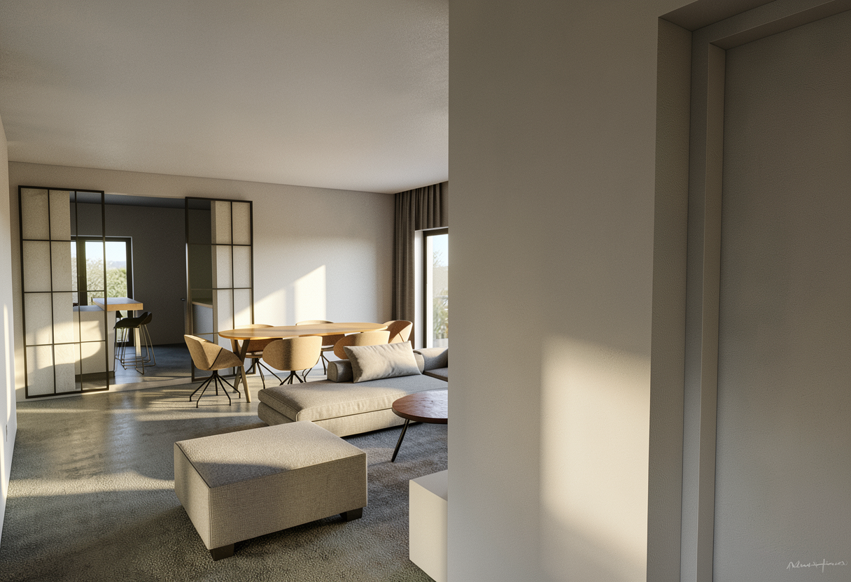convert this floor plan into a realistic isometric 3d view of a full house show the space from an elevated angle with furniture walls and details visible show floor plan for a modern office in light oak flooring tones of taupe and slate blue use the same furniture as shows on the plan do not change the orientation of the floorplan