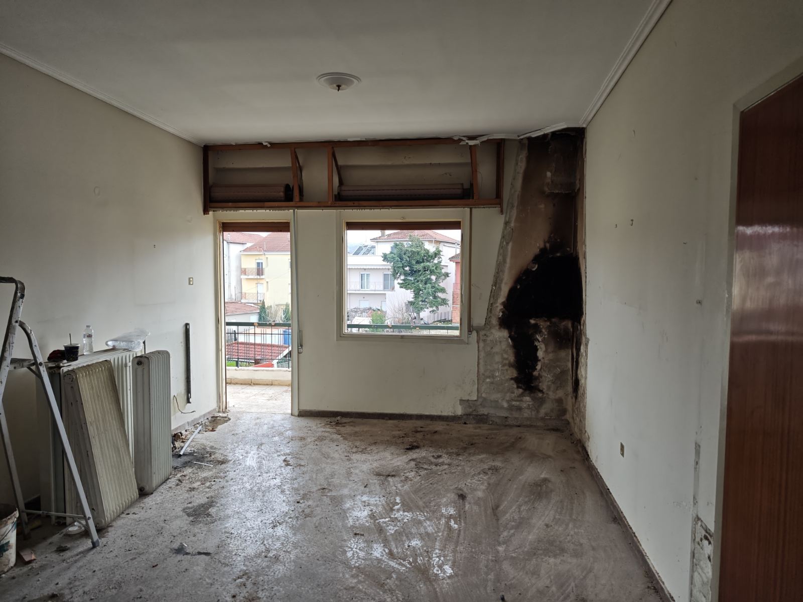 a beautifully renovated room with a modern cozy atmosphere bright freshly painted white walls the ceiling with soft recessed lighting creating a warm ambiance a large window with sheer white curtains lets in natural light highlighting a newly refinished wooden floor in a rich walnut tone the corner features a decorative dark stone fireplace adding a rustic charm walls adorned with minimalistic art in pastel blues and greens add a stylish indoor plant in a corner in a sleek white pot a chic ladder style bookshelf with neatly arranged books and small decor items adds sophistication the whole scene evokes warmth and elegance