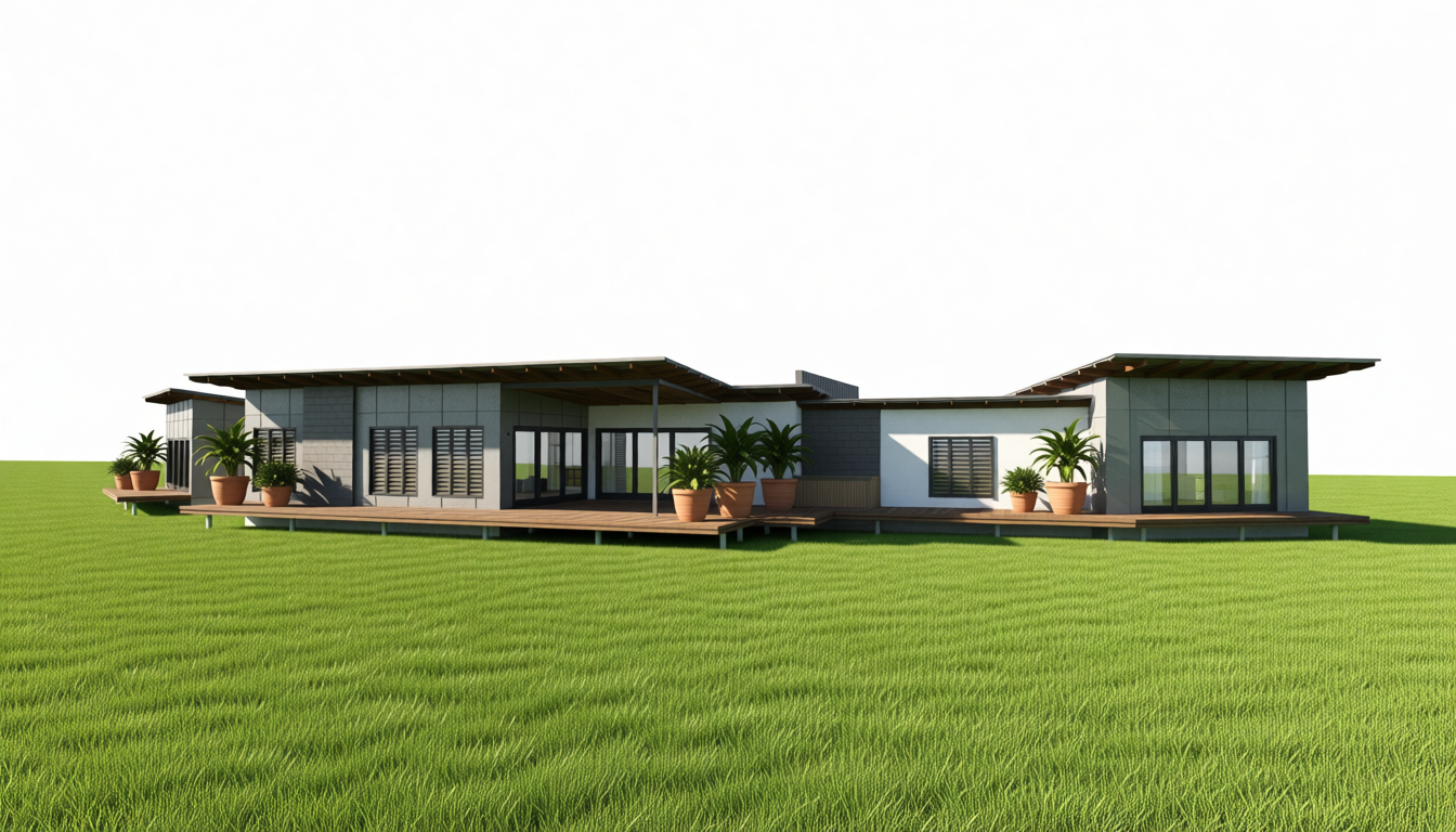 evening view with lights on inside the restaurant partially fill the amphitheater seating with people and kids dressed in casual resort clothes add some people walking up and down the amphitheater steps enhance the landscaping add some lighting on the stage in the foreground put some musicians performing on the stage with musical instruments and other performance equipment add spot lights on the stage performers add people sitting at tables on the top level of the theater next to the restaurant building with drinks on the tables watching the stage add a moon in the sky in the upper left corner of the view make the hedges more natural and realistic looking make the inside of the building look like a restaurant inside with mood lighting add step lights to the stairs in the amphitheater