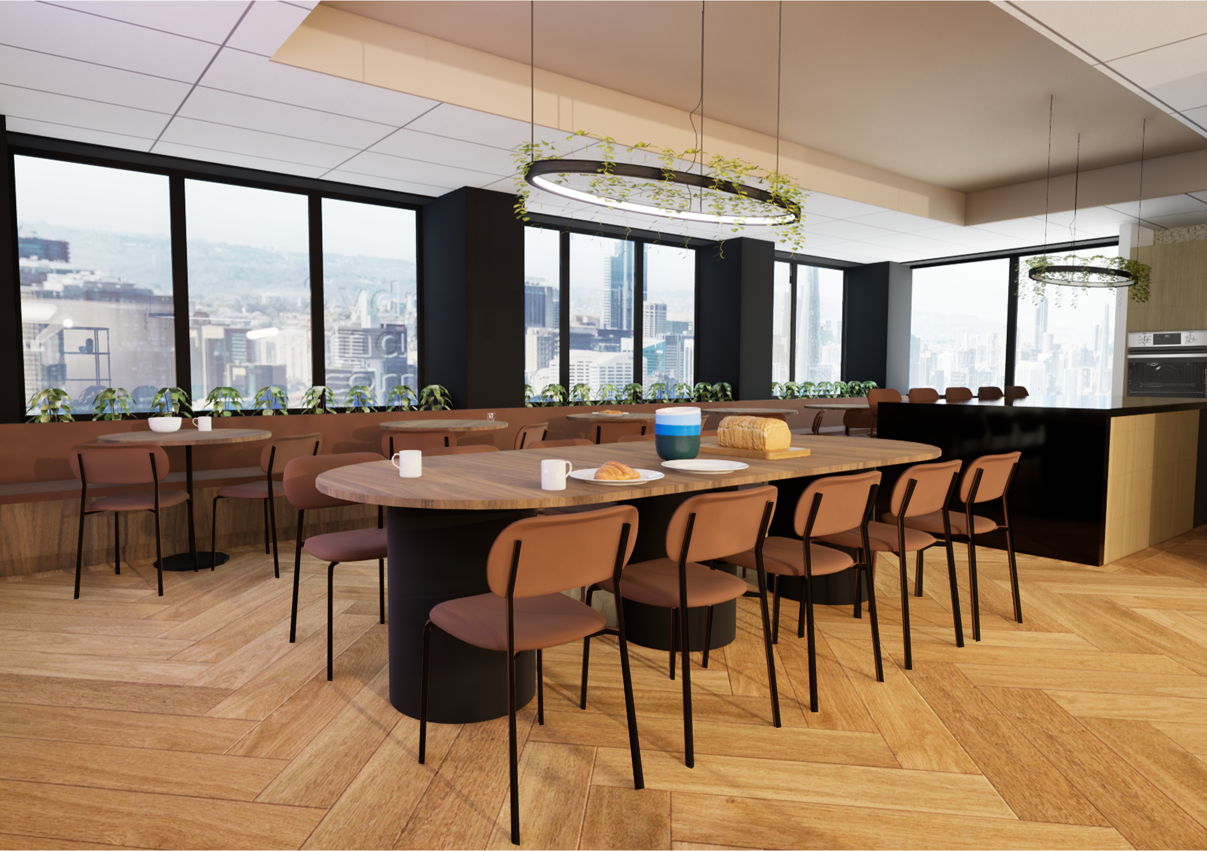 this is an interior image of an office kitchen area for a client make this render realistic do not make change any other changes or modifications to the existing scene