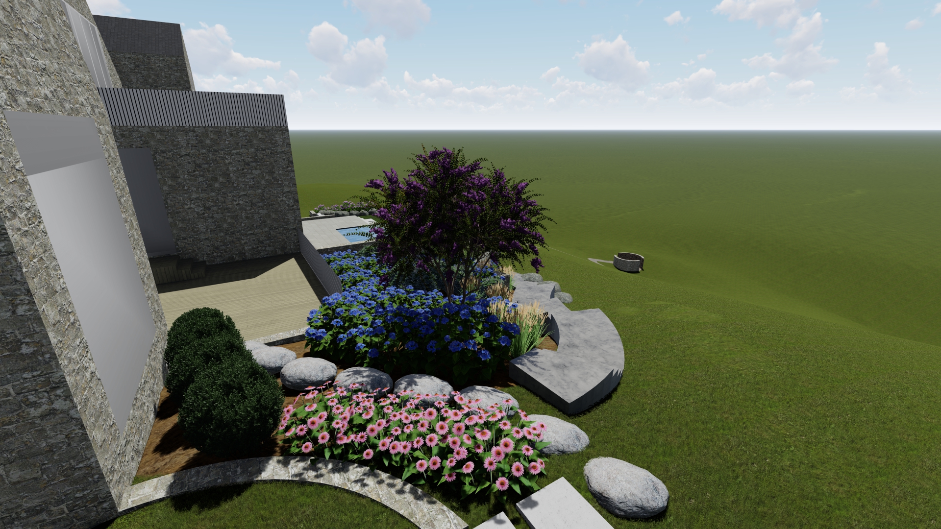 match the styles and materials of the previous renderings add trees in the background