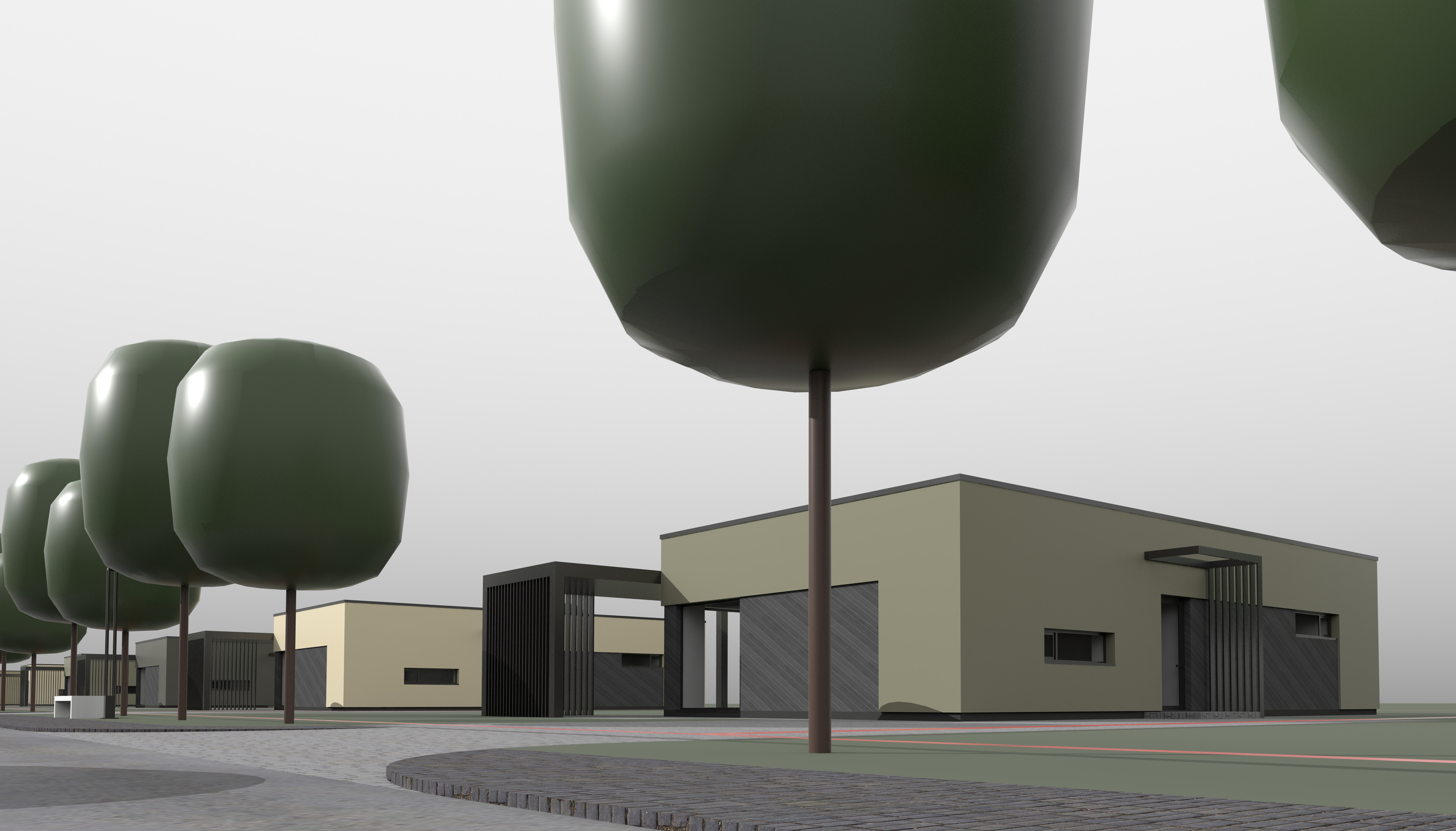 minimalist modern architecture single story building with clean lines and large windows soft olive green facade matte dark grey accents 45 degrees wood planks smooth concrete tile pavement asphalt road scots pine trees with deep green foliage and brown trunks overcast sky creating a calm and serene atmosphere soft diffused lighting enhancing the minimalist aesthetic change red lines to dark grey metal fence