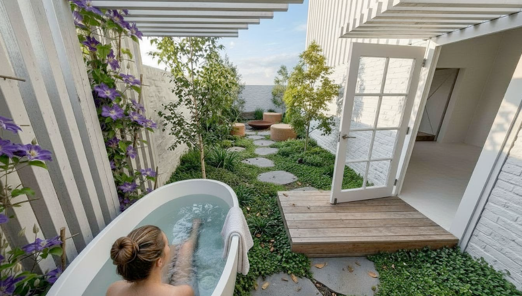 change timber pergola to aluminum put a swimsuit on the lady in the bath